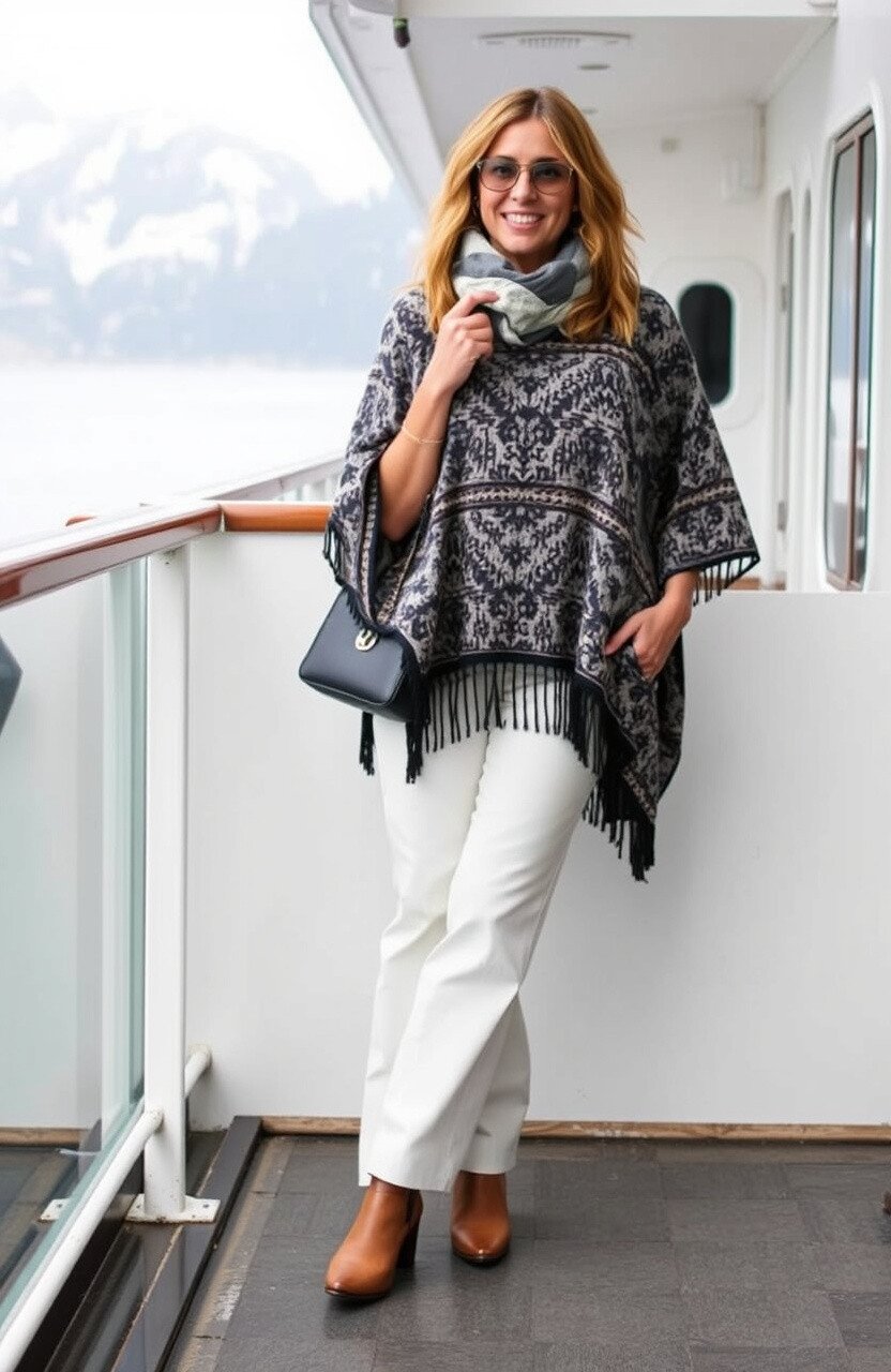 A chic poncho can add a touch of elegance to your waterproof pants outfit. Look for ones with intricate patterns or fringe for added flair.