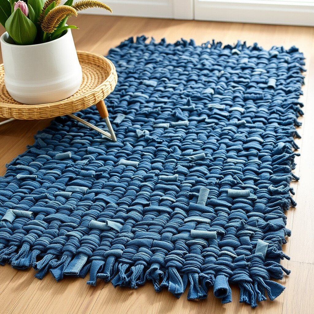 Denim jeans that are too worn to wear can be repurposed into a durable rag rug. Cut them into strips and weave or braid them together for a rustic look.