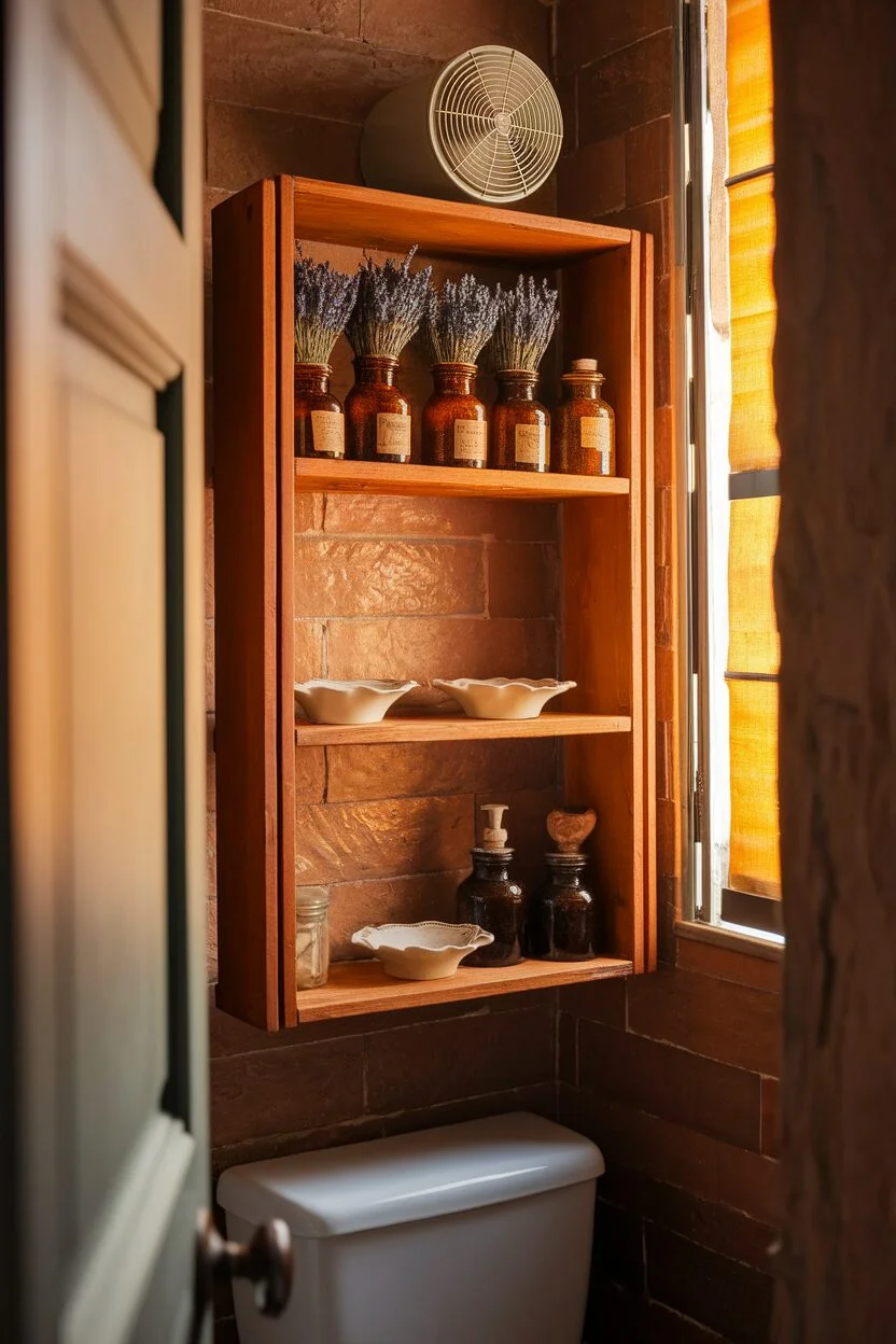 Choose vintage or rustic shelves to enhance your decor and keep the air flowing freely. You can display essentials like towels, plants, or pretty jars!