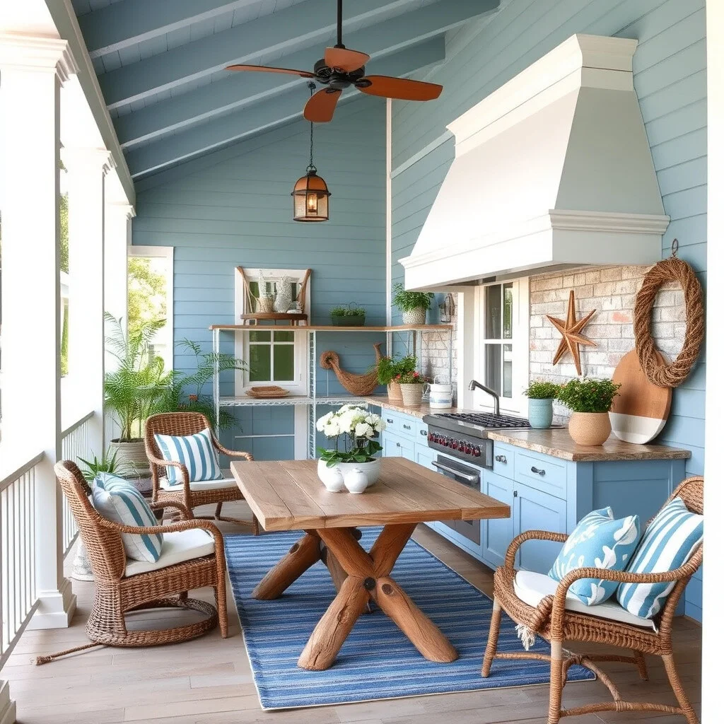 Soft blues, whites, and natural textures bring the seaside to your porch.
