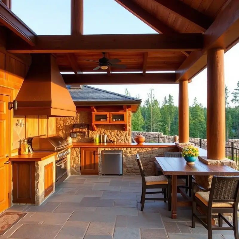 Think warm woods, stone textures, and earthy tones. A rustic outdoor kitchen feels like a retreat in the woods.
