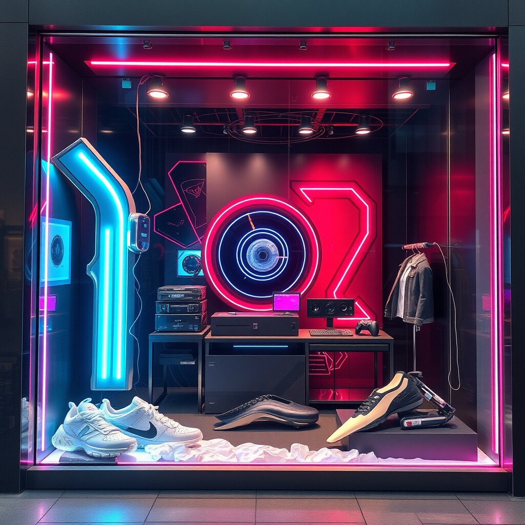 This is perfect for tech-related stores or those wanting to convey cutting-edge innovation. It’s a bold look that’s sure to attract attention from tech enthusiasts.
