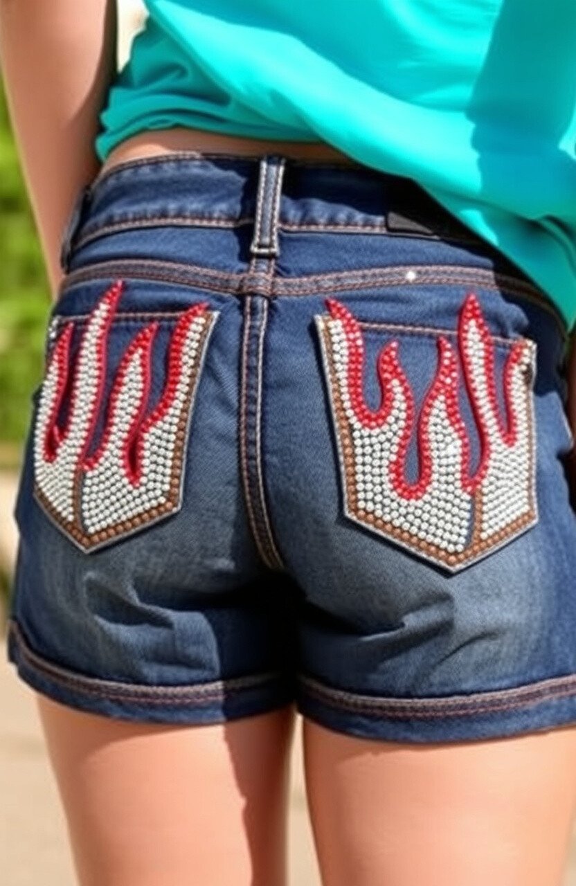 Add a streak of fire to your summer wardrobe with rhinestone-embellished denim shorts. The flames can be placed on the sides or back pockets, adding a playful touch.