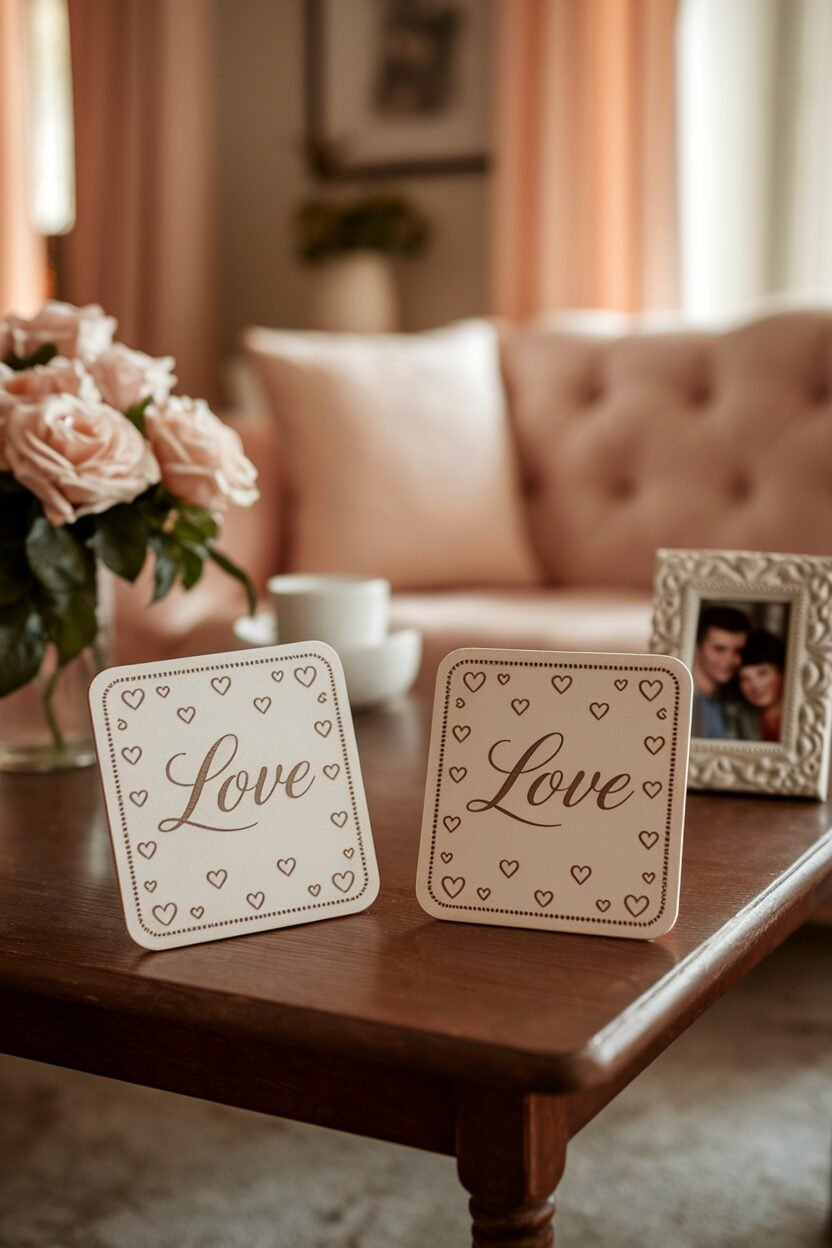 Coasters can be both functional and decorative. Choose ones with romantic quotes or designs to add charm to your coffee table.