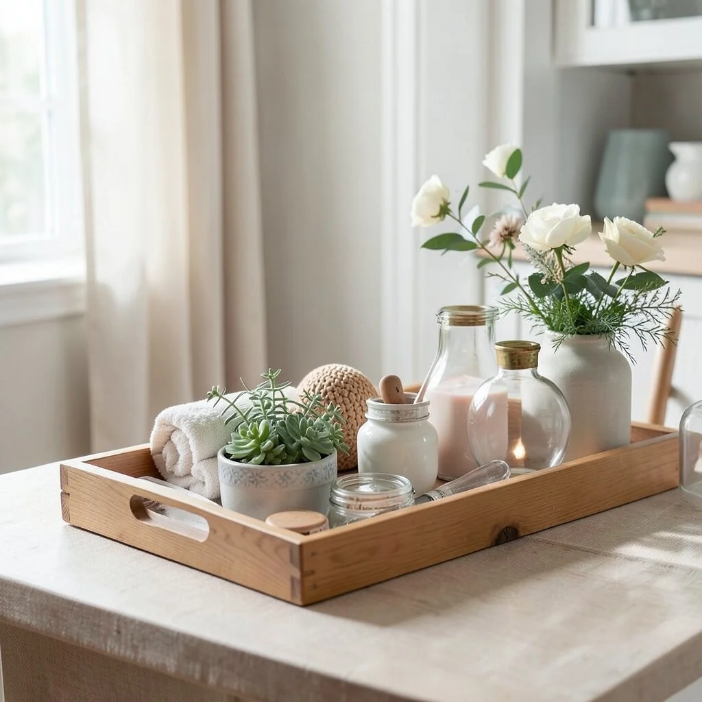 A tray can make a surface look neat and styled at the same time. It gathers small items together so they feel like one display.