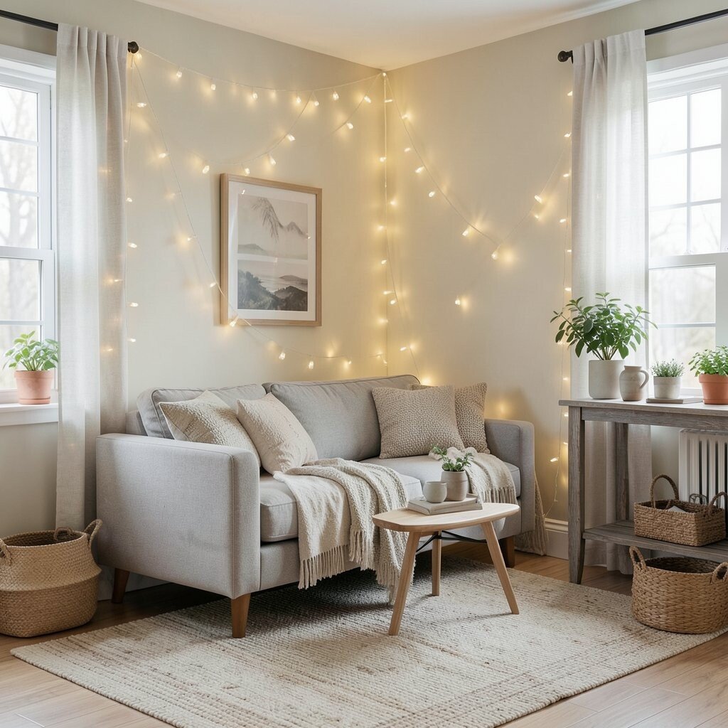 String lights can make a room feel dreamy and warm at night. Their tiny bulbs give off a gentle shine that feels less harsh than a ceiling light.