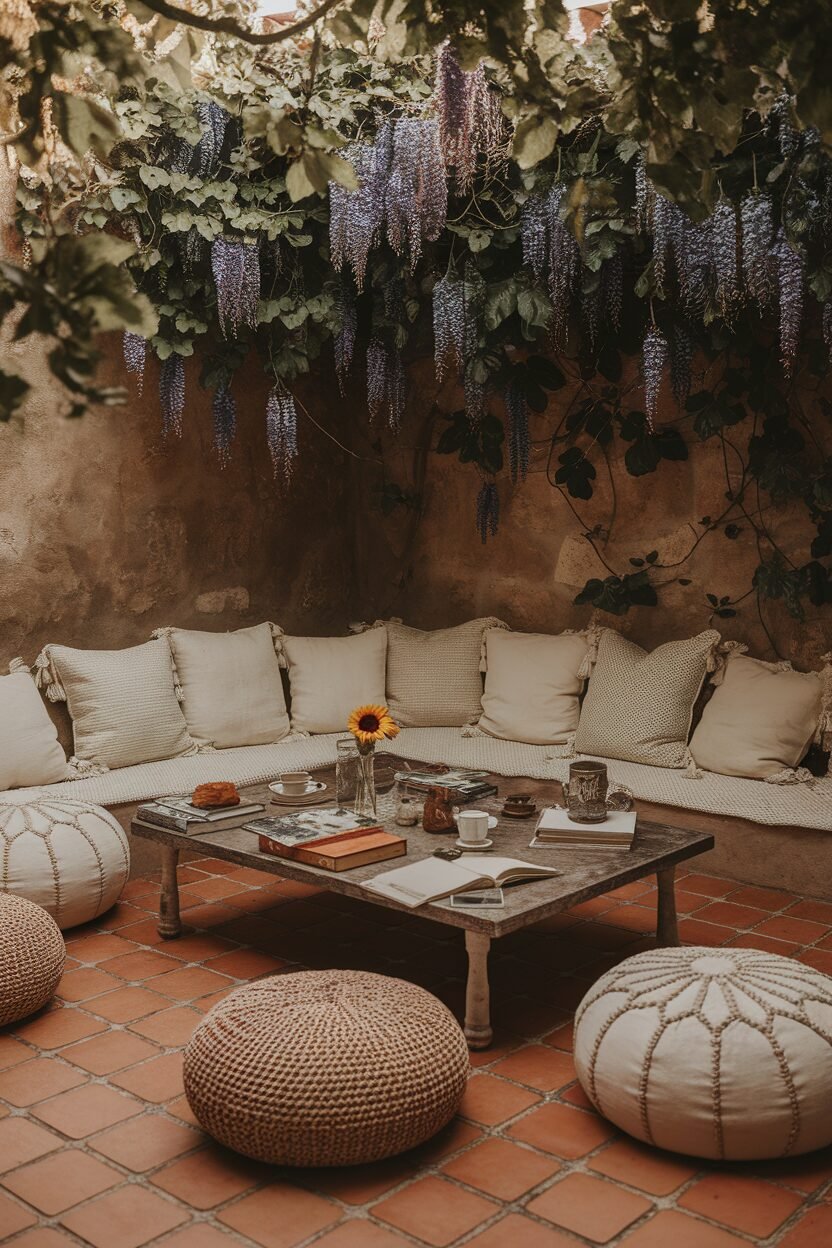 Create a bohemian outdoor lounge with colorful textiles and eclectic decor. Use rugs, cushions, and fairy lights.
