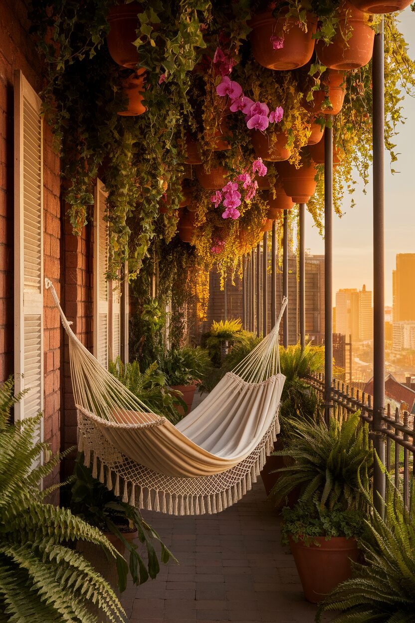 Turn your balcony into an urban jungle with plants and cozy seating. Use vertical gardening for more greenery.