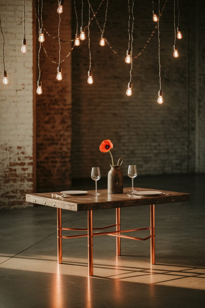 Create an industrial chic dining room with metal and wood accents. Use exposed pipes and modern decor.