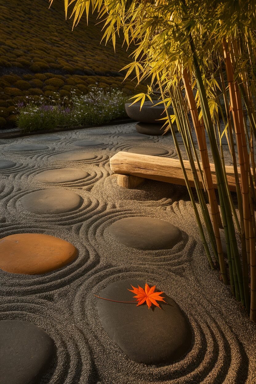 Create a peaceful outdoor retreat with a Zen garden patio. Use stones, water features, and greenery.