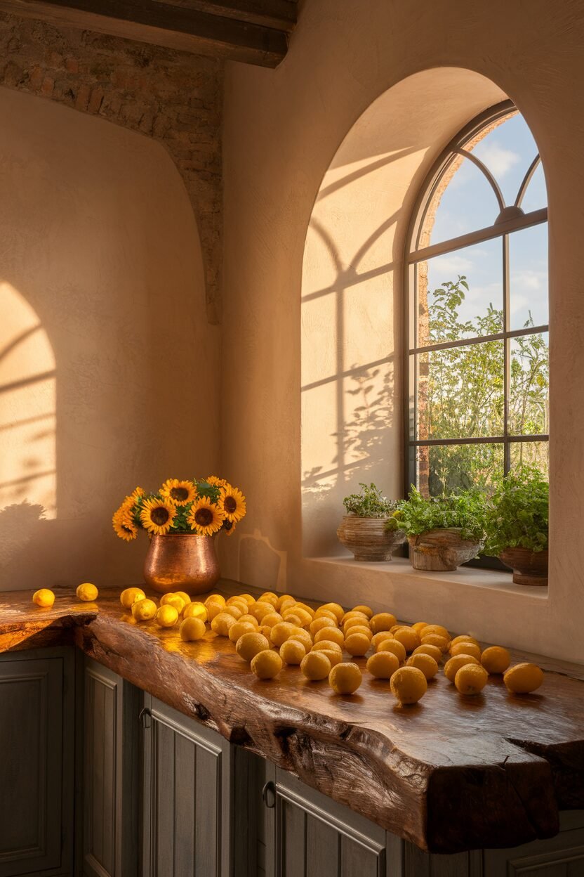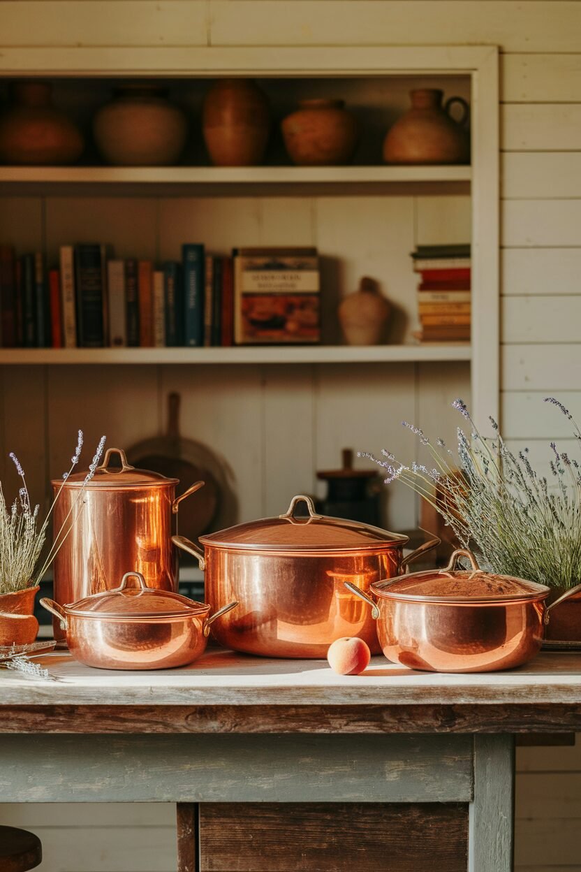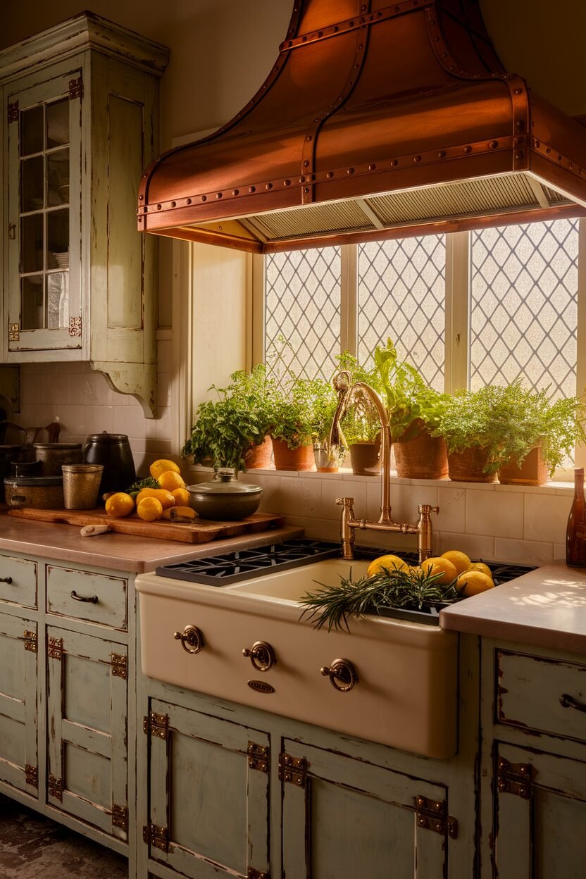 A farmhouse kitchen is warm and welcoming. Use rustic wood, open shelves, and vintage accents.