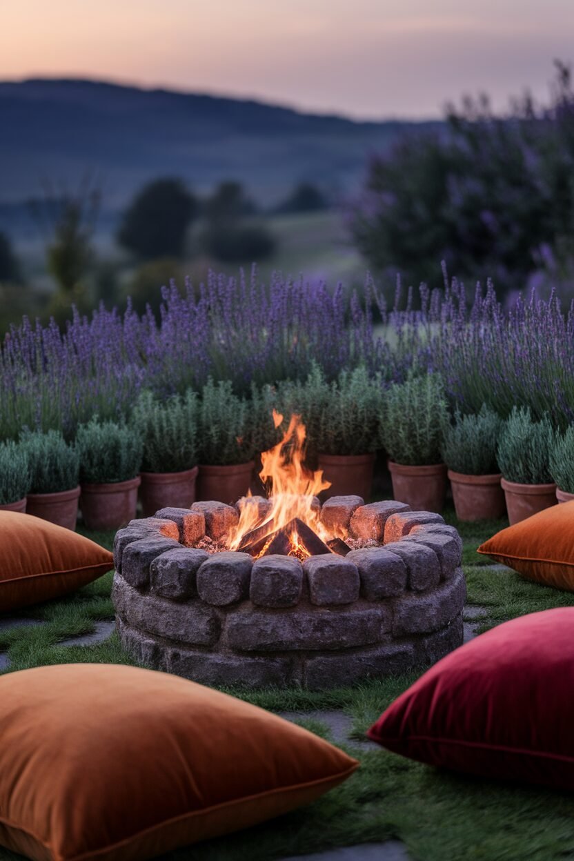 Create a cozy fire pit area for outdoor gatherings. Use comfortable seating and ambient lighting.