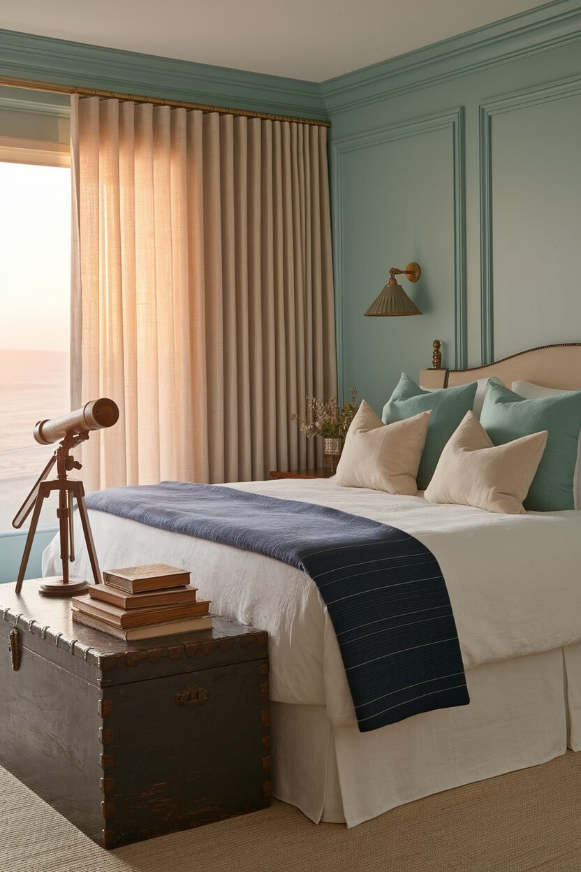 Bring the seaside to your bedroom with a nautical theme. Think navy blues, whites, and seaside decor.