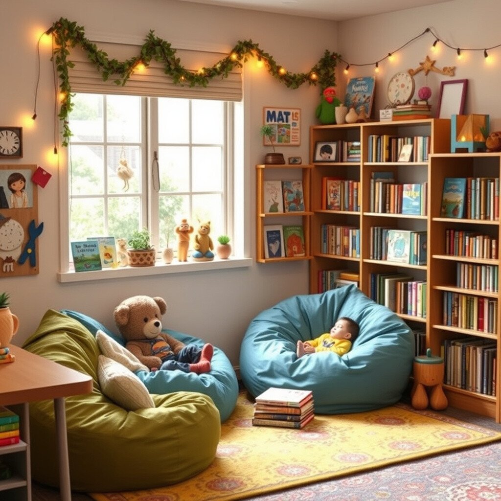 Turn a classroom corner into a magical story nook. Fill it with comfy bean bags and shelves of colorful storybooks. Add fairy lights for a cozy glow.