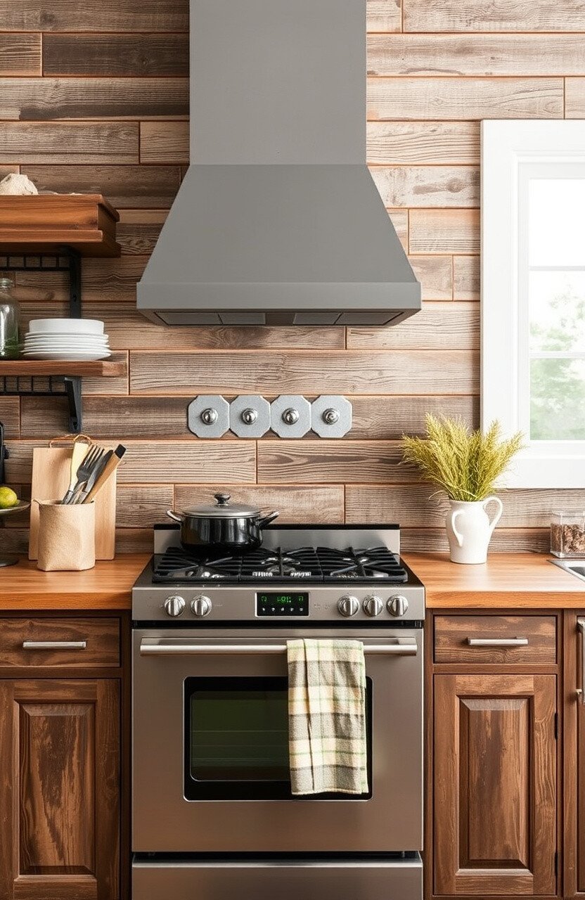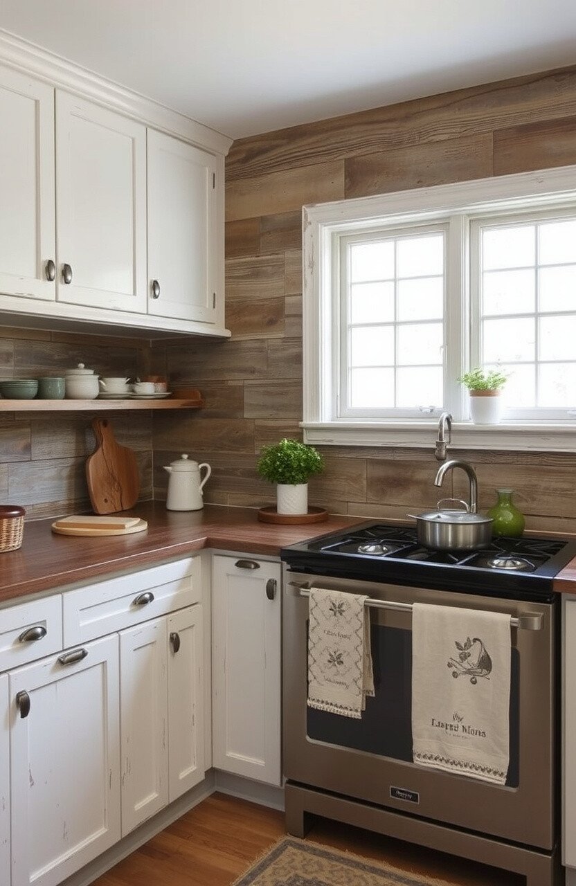 Weathered wood panels bring a cozy, rustic feel to your kitchen. Their aged appearance tells a story.