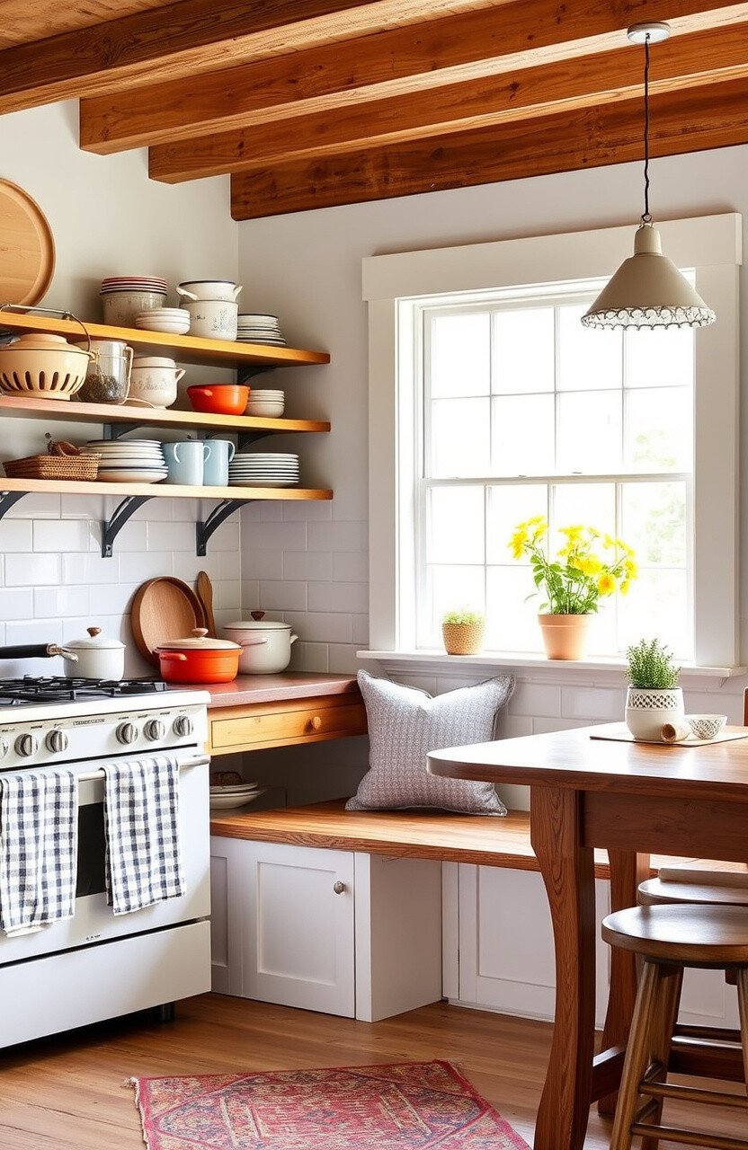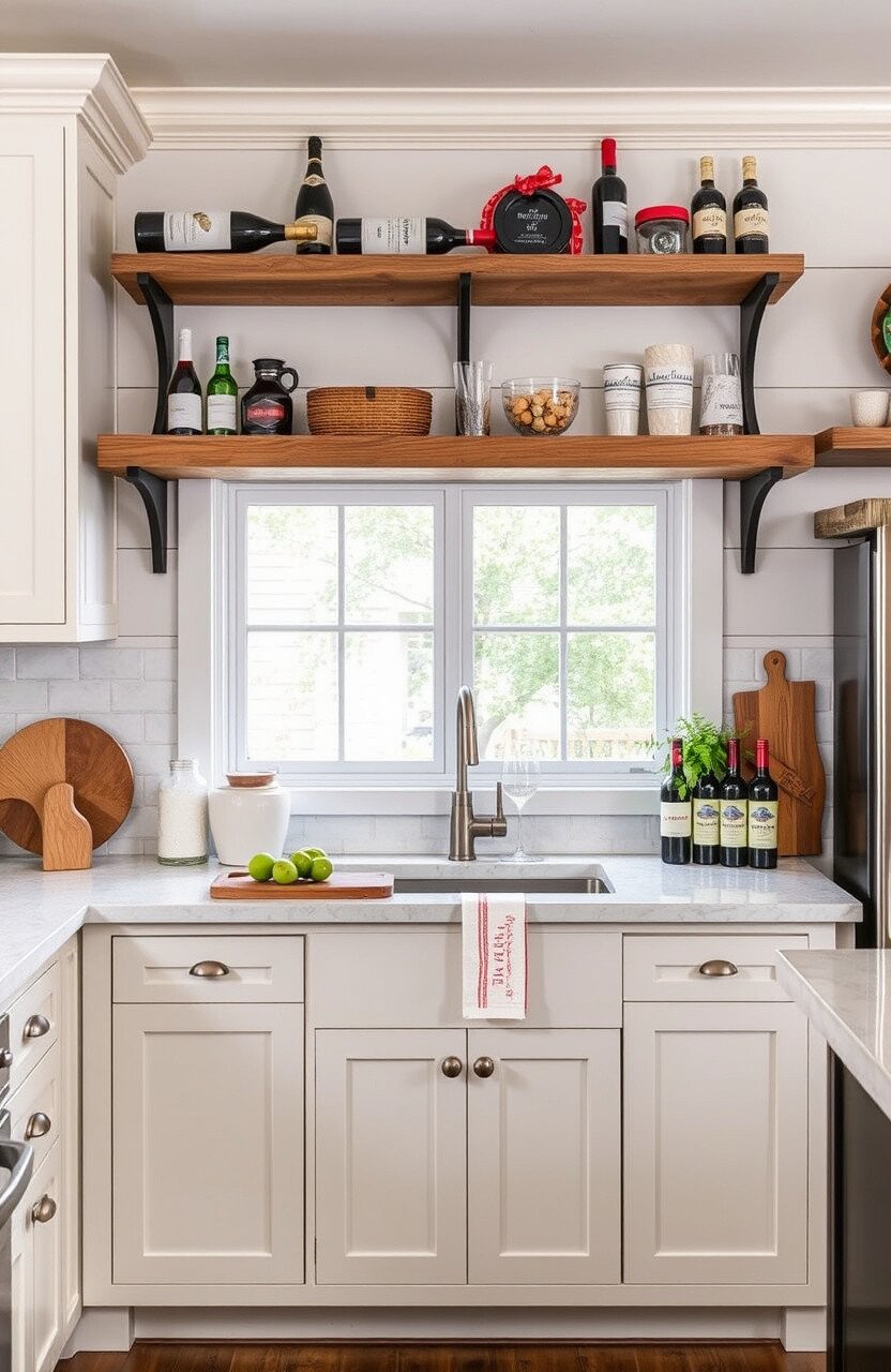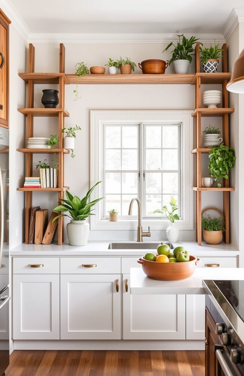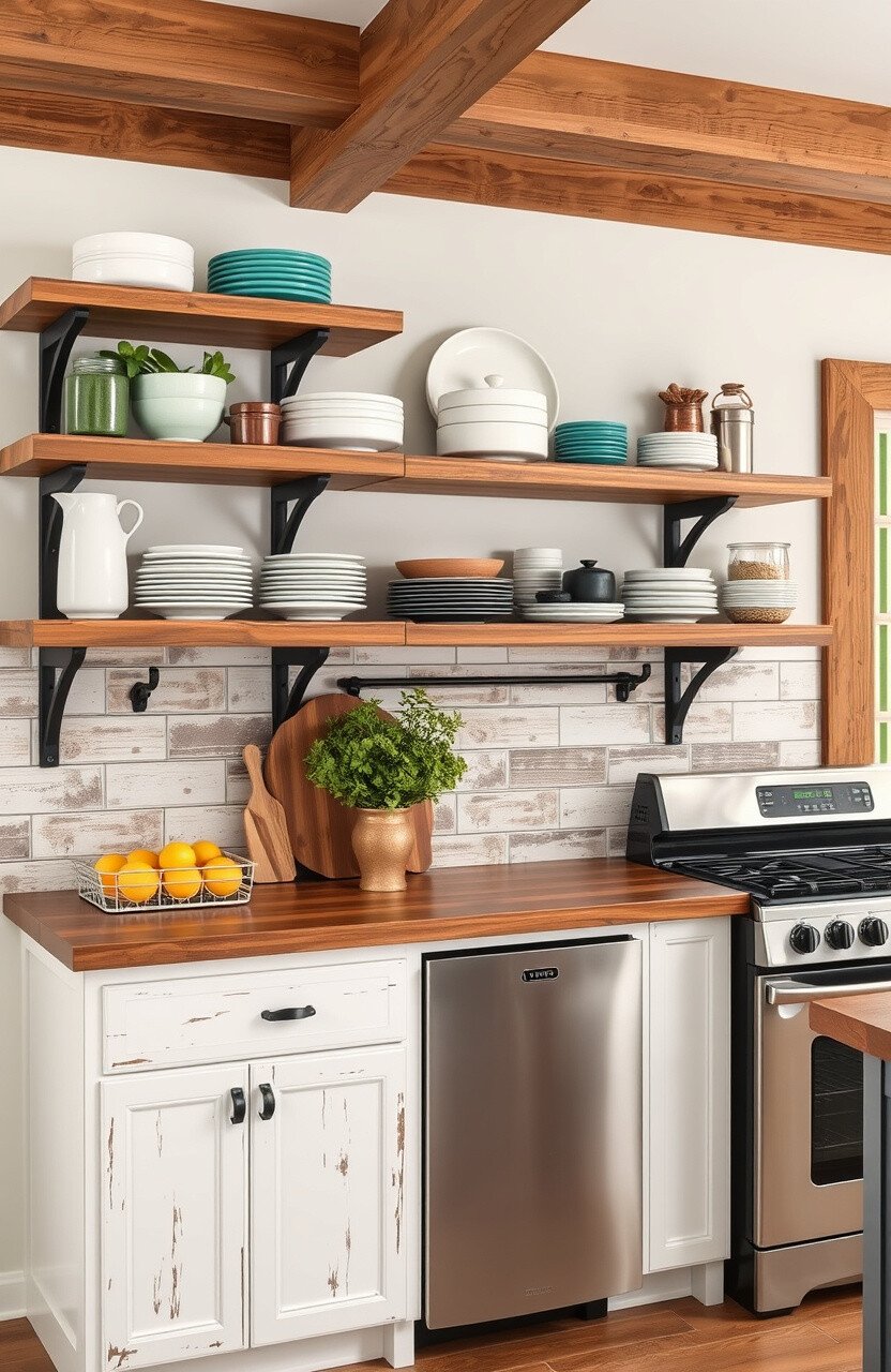 Open shelves made of rustic wood can showcase your favorite dishes and trinkets. They add openness and accessibility.