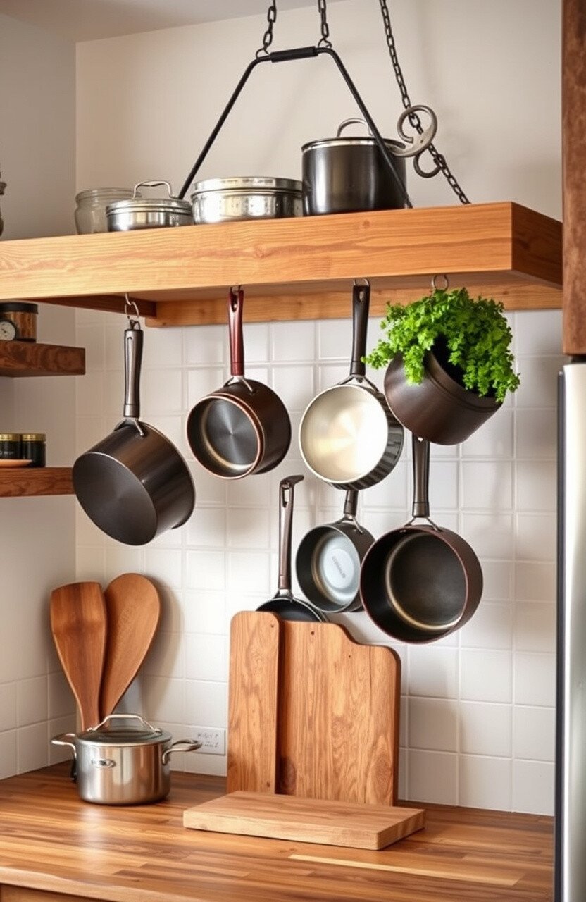 A pot rack adds both function and style. It keeps your kitchen organized and your cookware within reach.