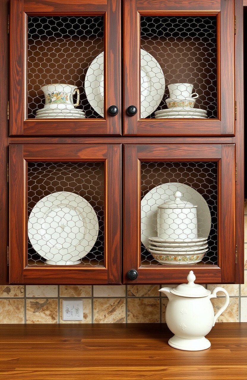 Chicken wire adds a rustic touch to cabinets. It lets you showcase your favorite dishes and glassware.