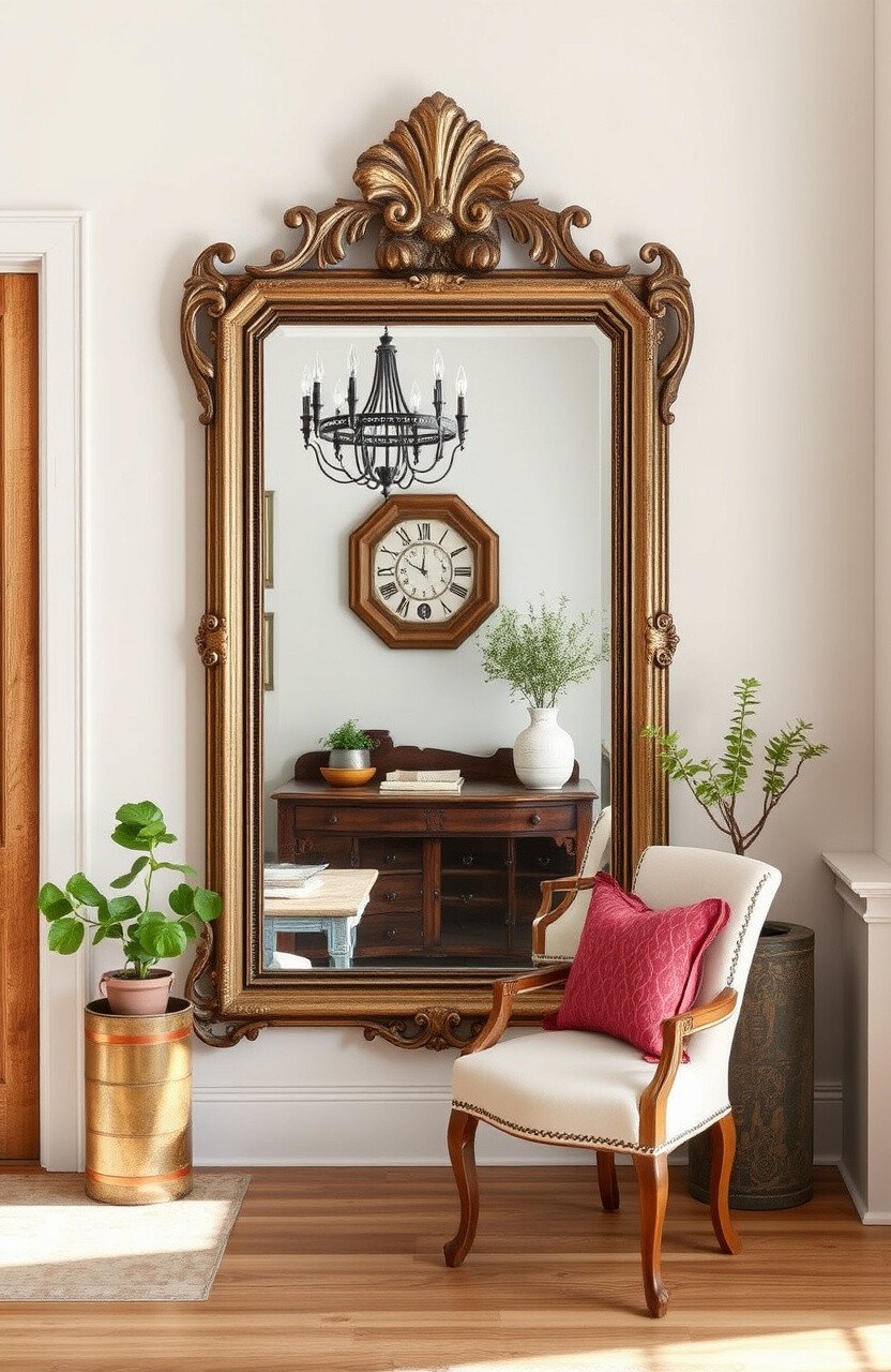 An antique wall mirror adds elegance and light. It creates the illusion of more space.