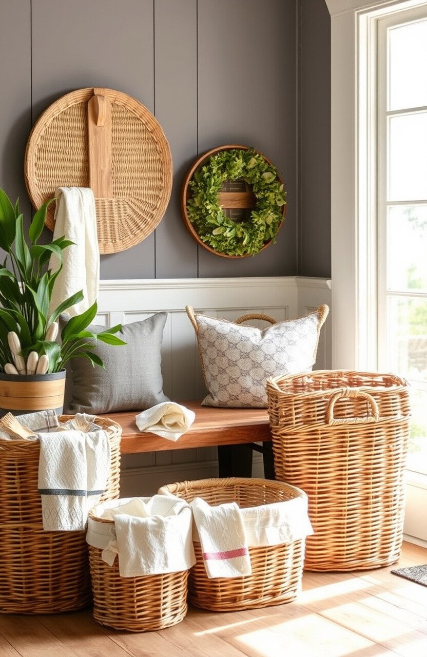 Wicker baskets are both stylish and practical. They offer storage while enhancing the rustic vibe.