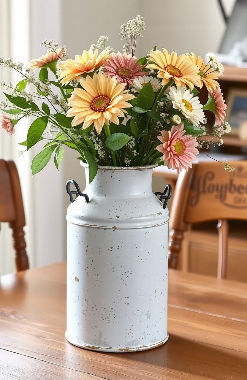 A metal milk can vase adds rustic charm. It’s perfect for holding fresh flowers.