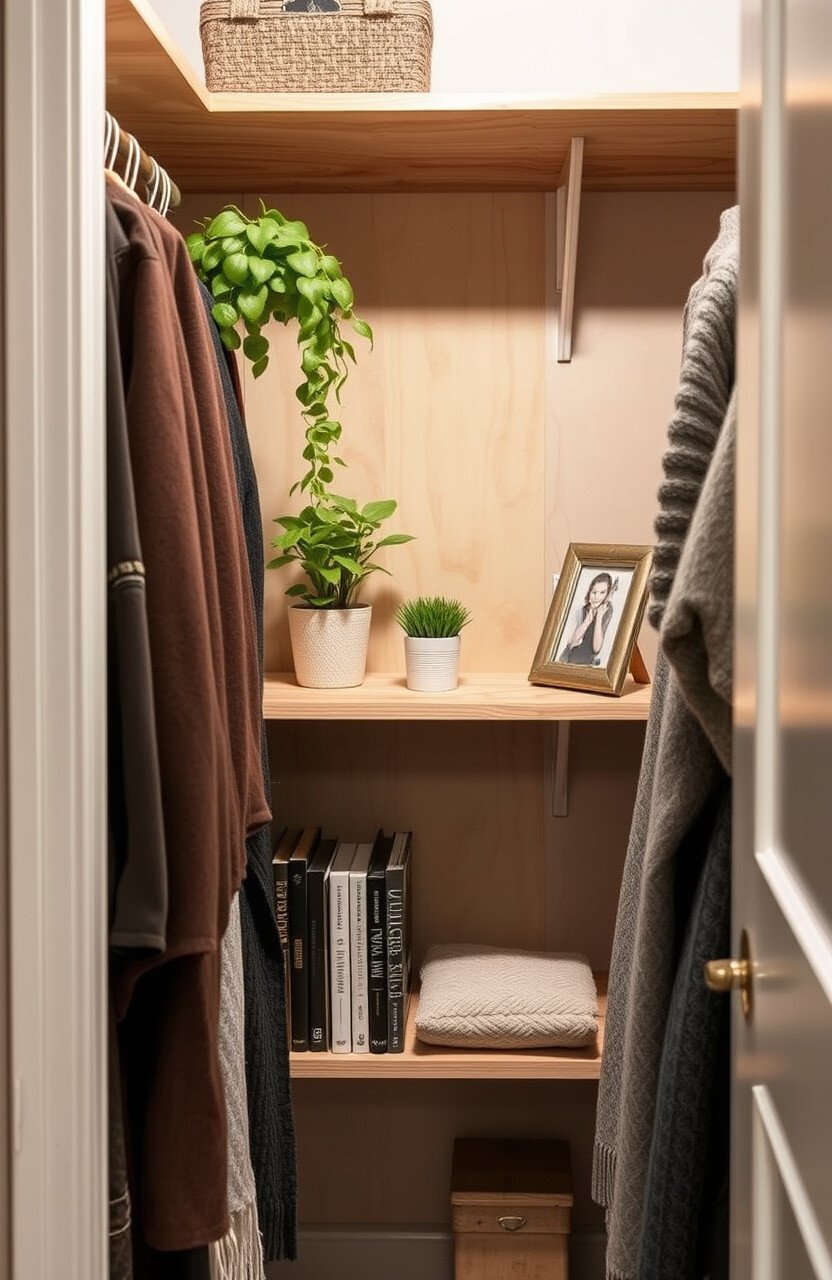 Picture a snug little nook in your closet where a plywood shelf wraps around the corner. It’s perfect for stacking books, displaying small potted plants, or keeping cozy throws within reach.