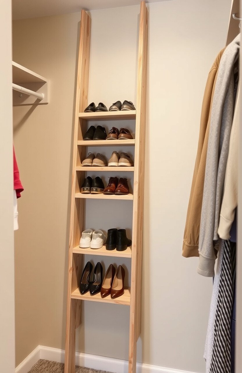 Imagine a ladder leaning against the wall of your closet, made entirely from rustic plywood. Each step holds your favorite shoes, neatly organized and easy to access.