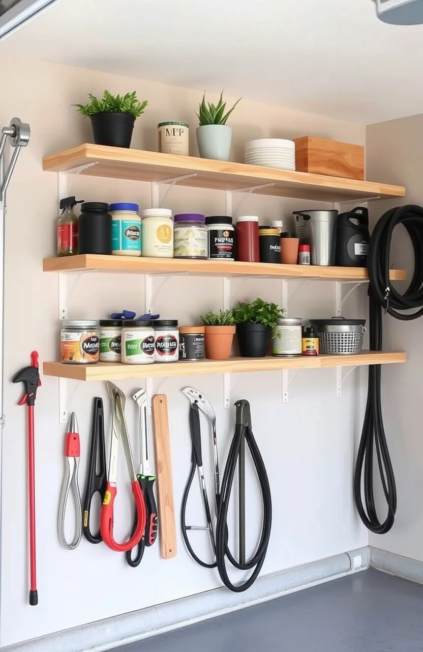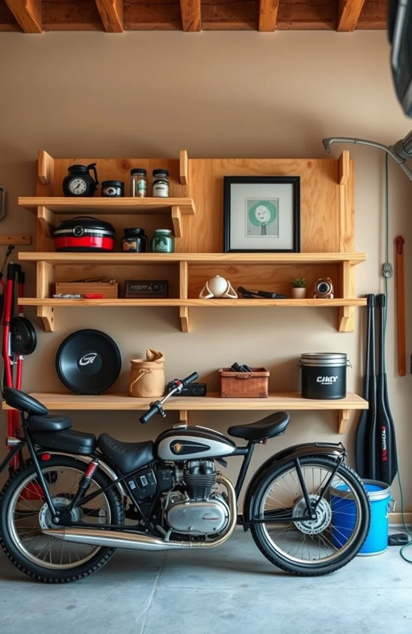 Picture this: a row of sleek, plywood shelves running along your garage wall, holding tools, paint cans, and maybe even a few potted plants. The floating design gives a modern touch while maintaining that rustic charm.