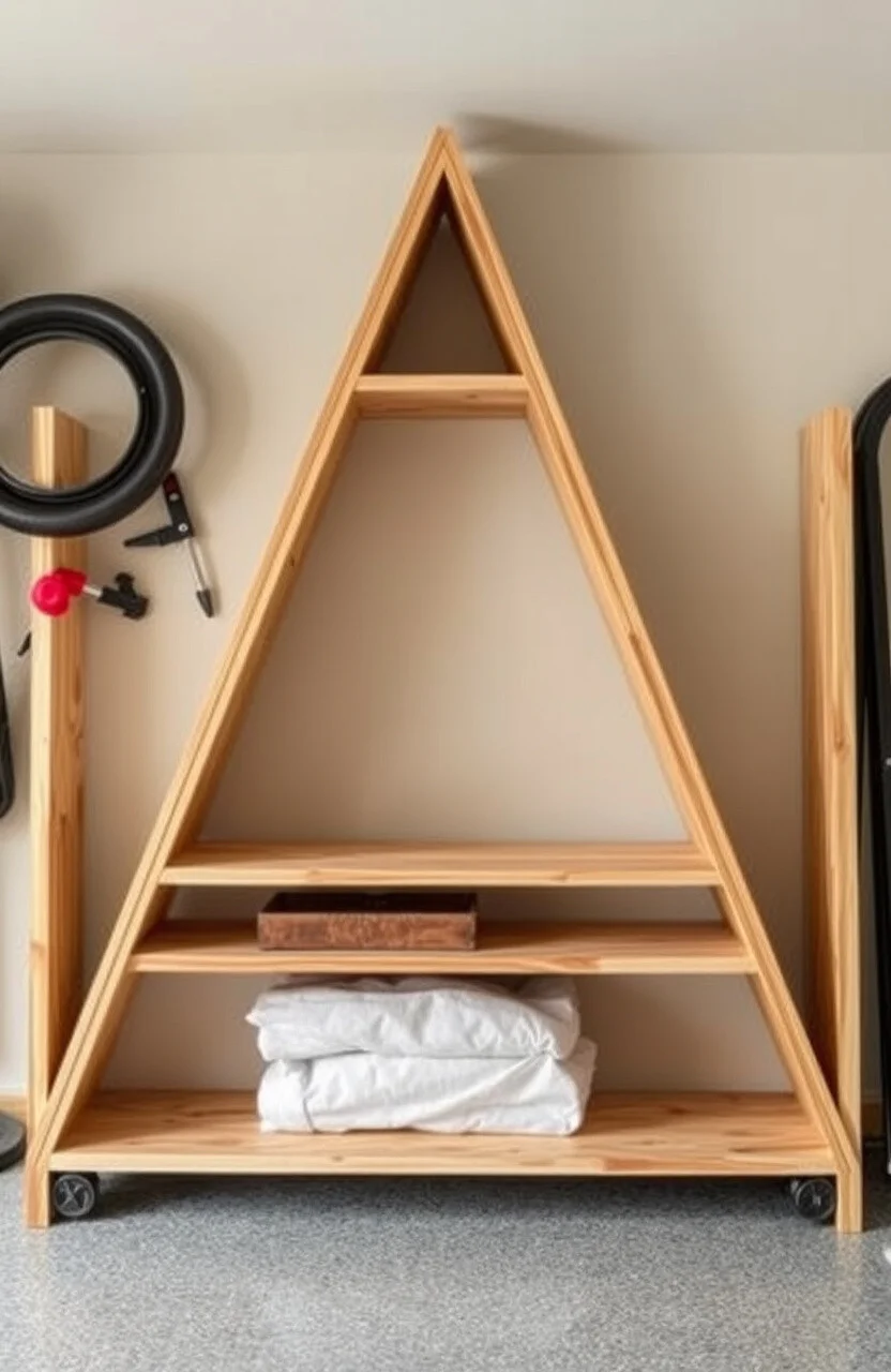 This shelf is shaped like the letter “A”, with plywood shelves stacked within the frame. It’s perfect for storing heavier items thanks to its sturdy design.