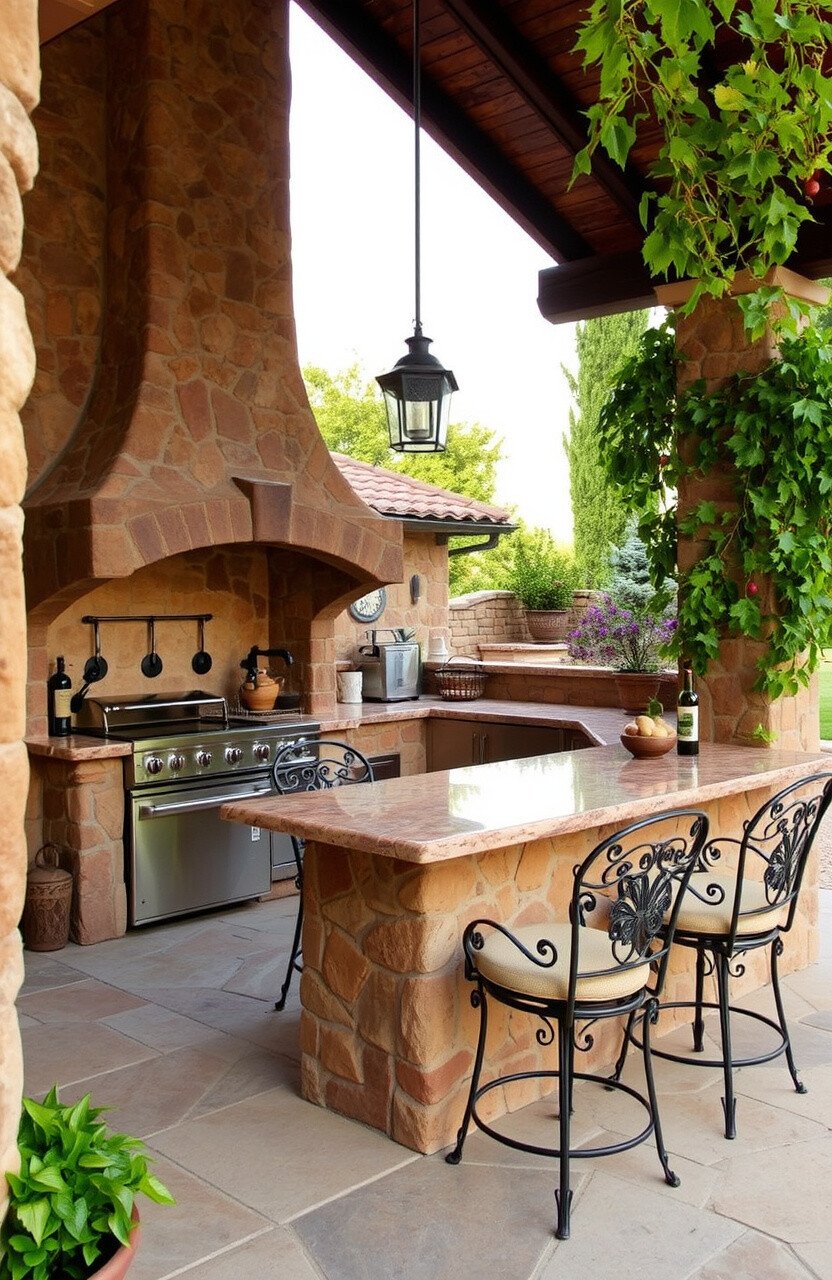 Bring a piece of Tuscany to your home with warm stone and terracotta accents. The bar seating, with wrought iron details, adds to the charm.