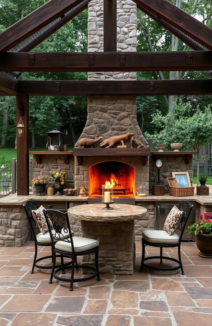 A stone fireplace serves as a stunning centerpiece in your outdoor kitchen. The crackling of logs adds a rustic touch.