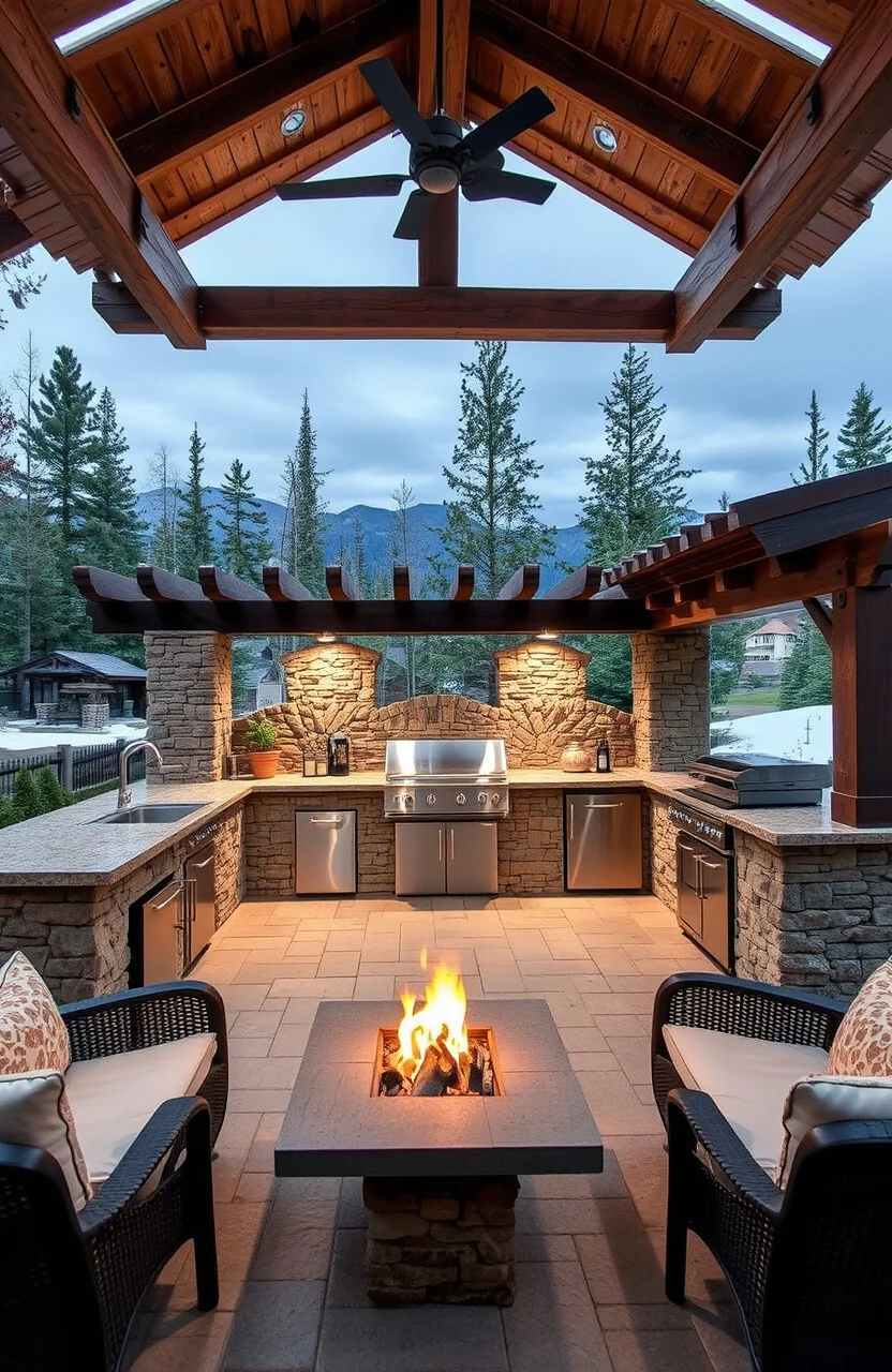 Create a mountain getaway feel with an outdoor kitchen designed to look like an alpine retreat. Stone walls and a wooden pergola set the scene.