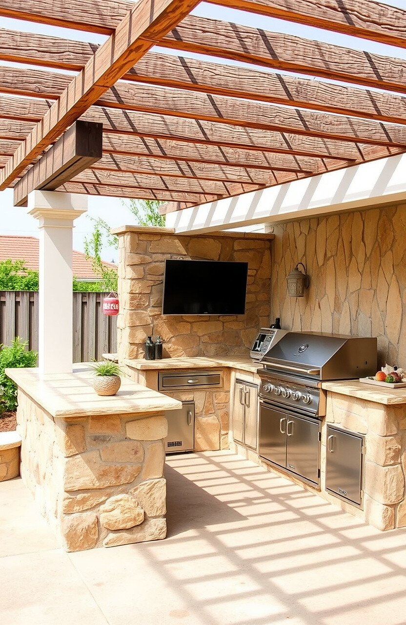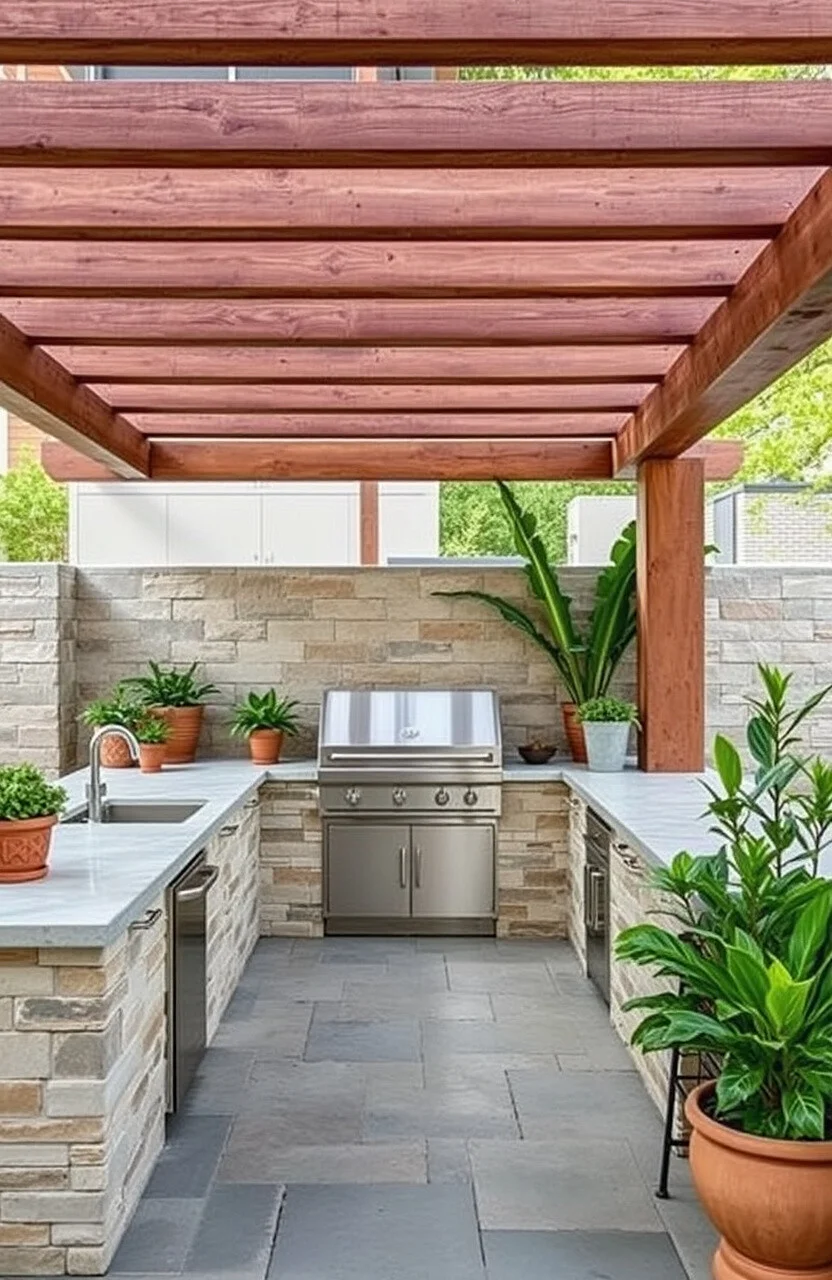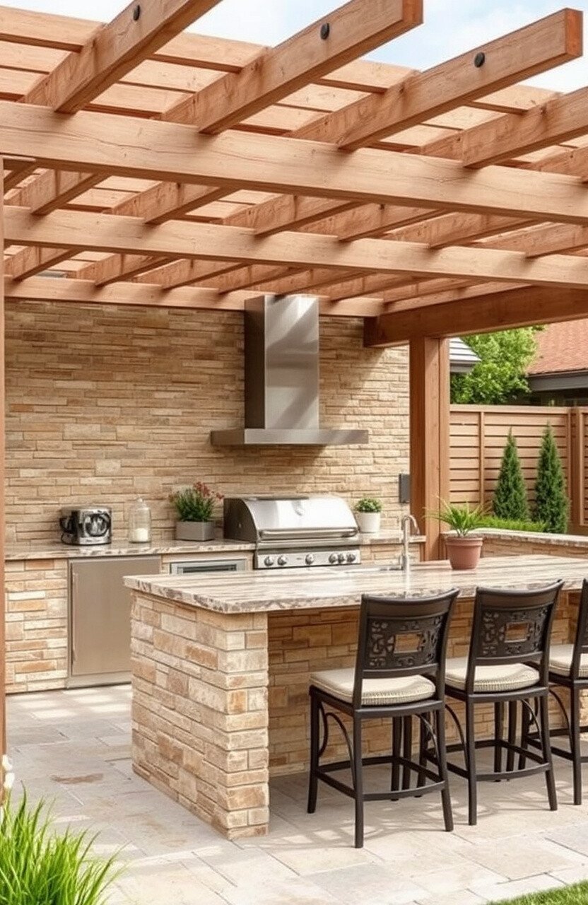 Blend modern and rustic styles in an outdoor kitchen that features stone textures and sleek lines. The pergola adds an architectural element.