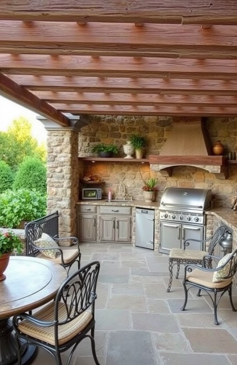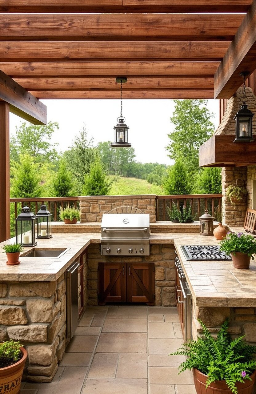 Embrace rustic elegance with a vintage farmhouse outdoor kitchen. Stone features and a wooden pergola create a timeless look.