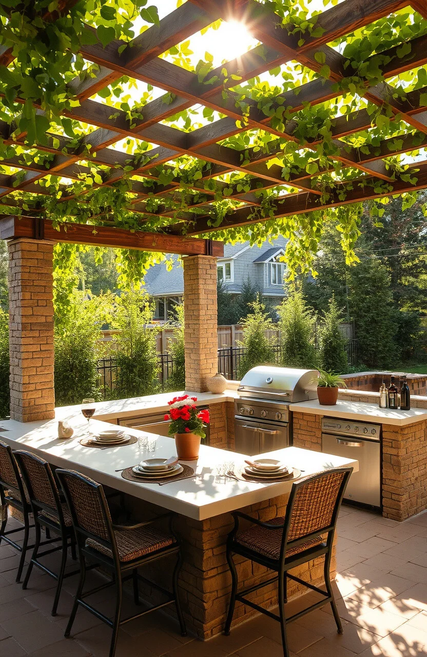 Imagine dining under a pergola where sunlight dances through the vines. The rustic stone bar serves as the perfect centerpiece.