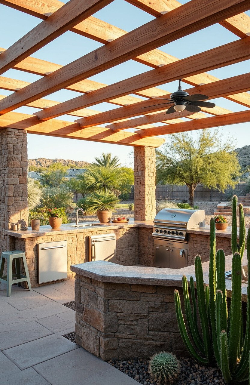 Capture the beauty of the desert with an outdoor kitchen featuring earthy stone and a pergola that offers much-needed shade.