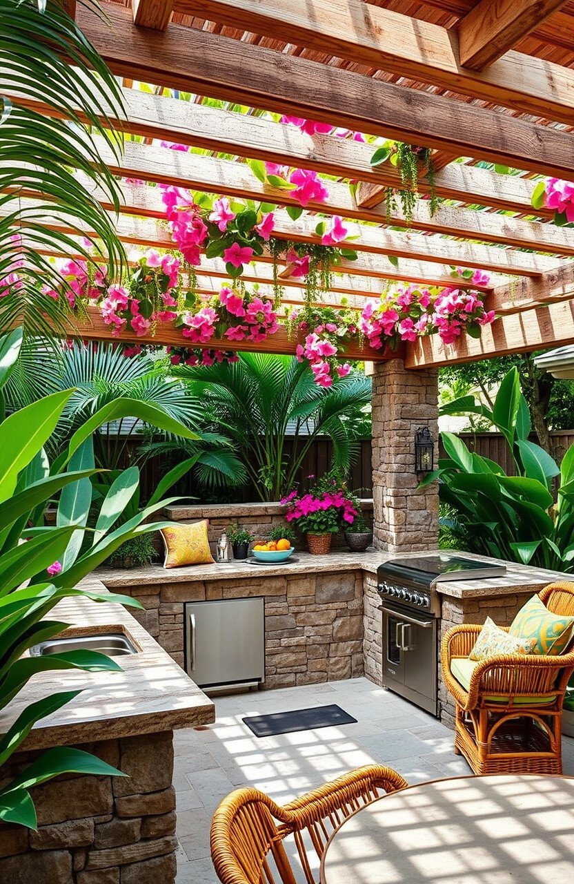 Turn your backyard into a tropical paradise with an outdoor kitchen surrounded by lush plants. Stone countertops add a natural touch.