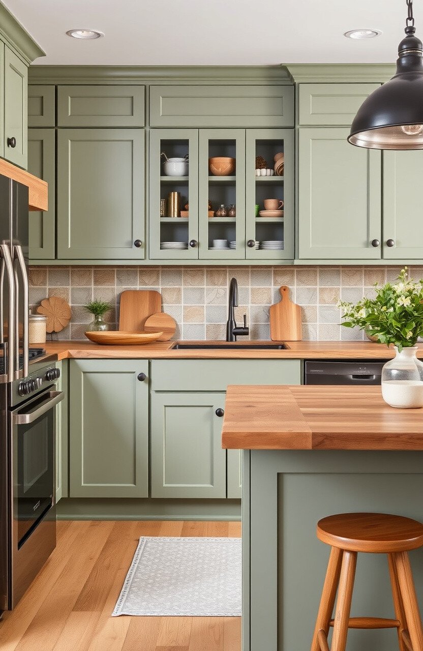 Pair sage green cabinets with rustic wood countertops for a warm, inviting look. The natural wood tones complement the soft green beautifully.