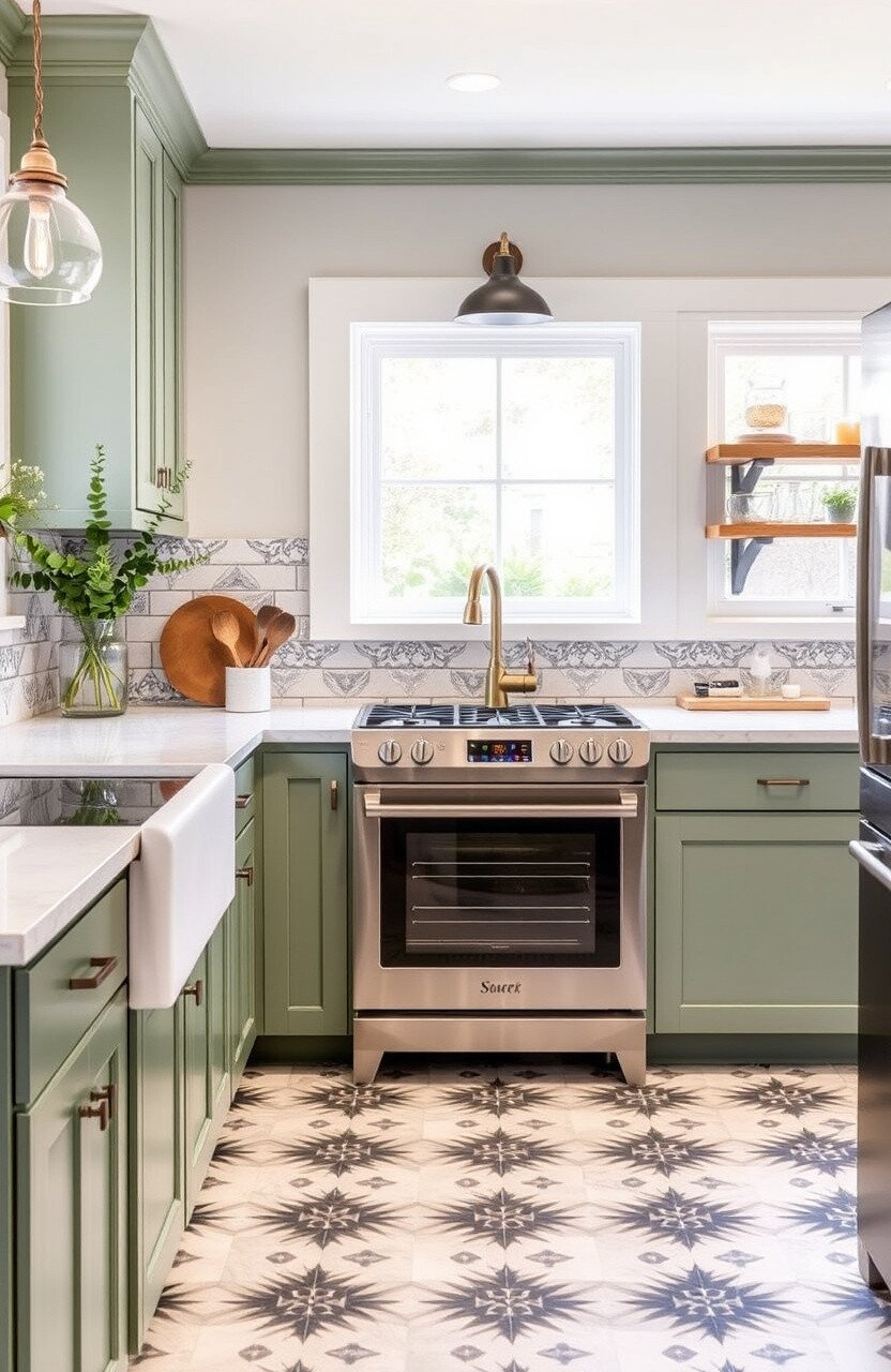Incorporate playful patterns with wallpaper or tiles behind your sage green cabinets. It’s a fun way to add personality to your kitchen.