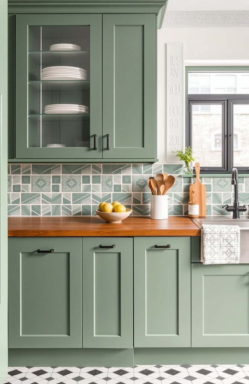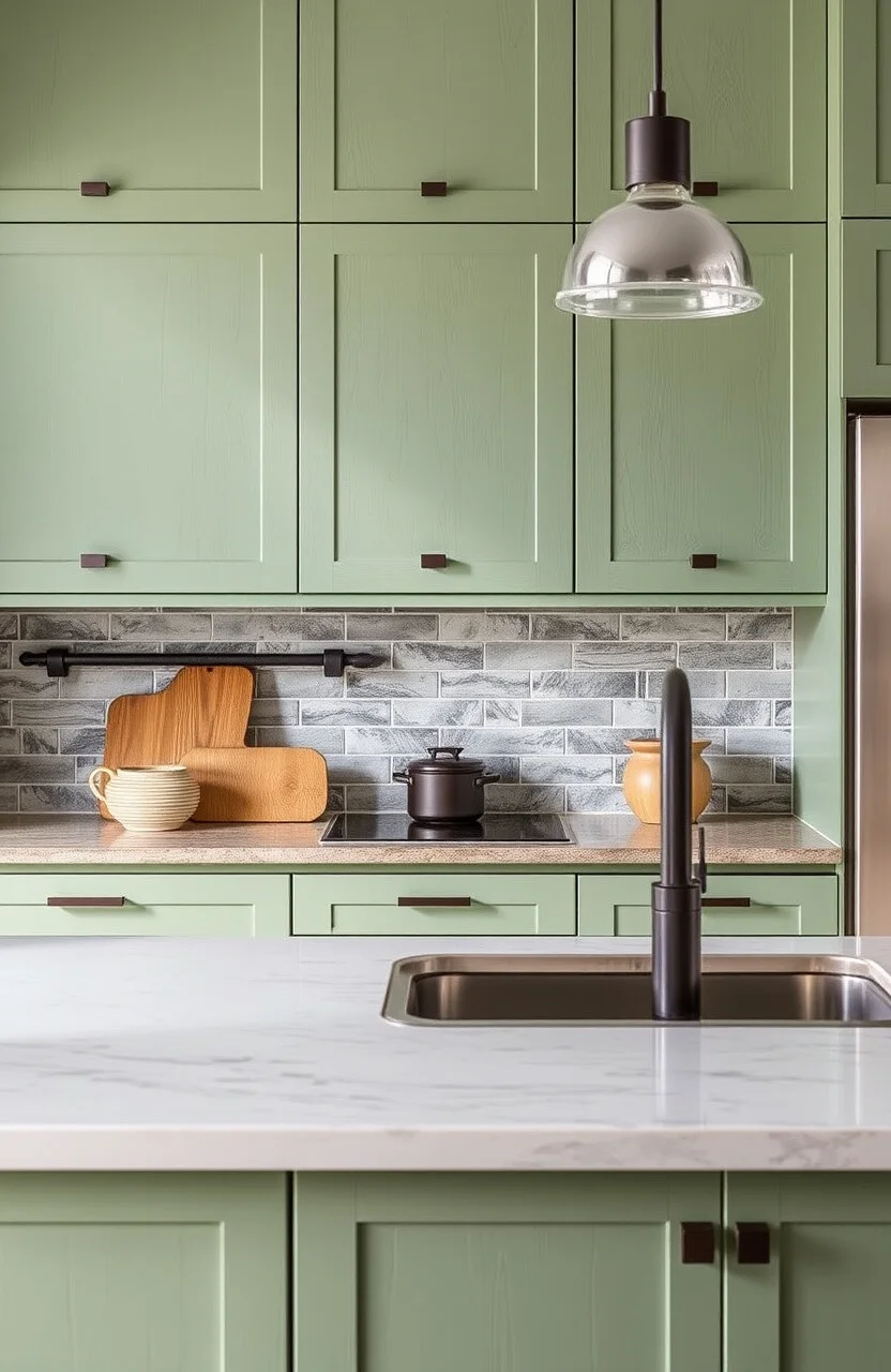 A bold backsplash can complement your sage green cabinets beautifully. Think subway tiles or geometric patterns.