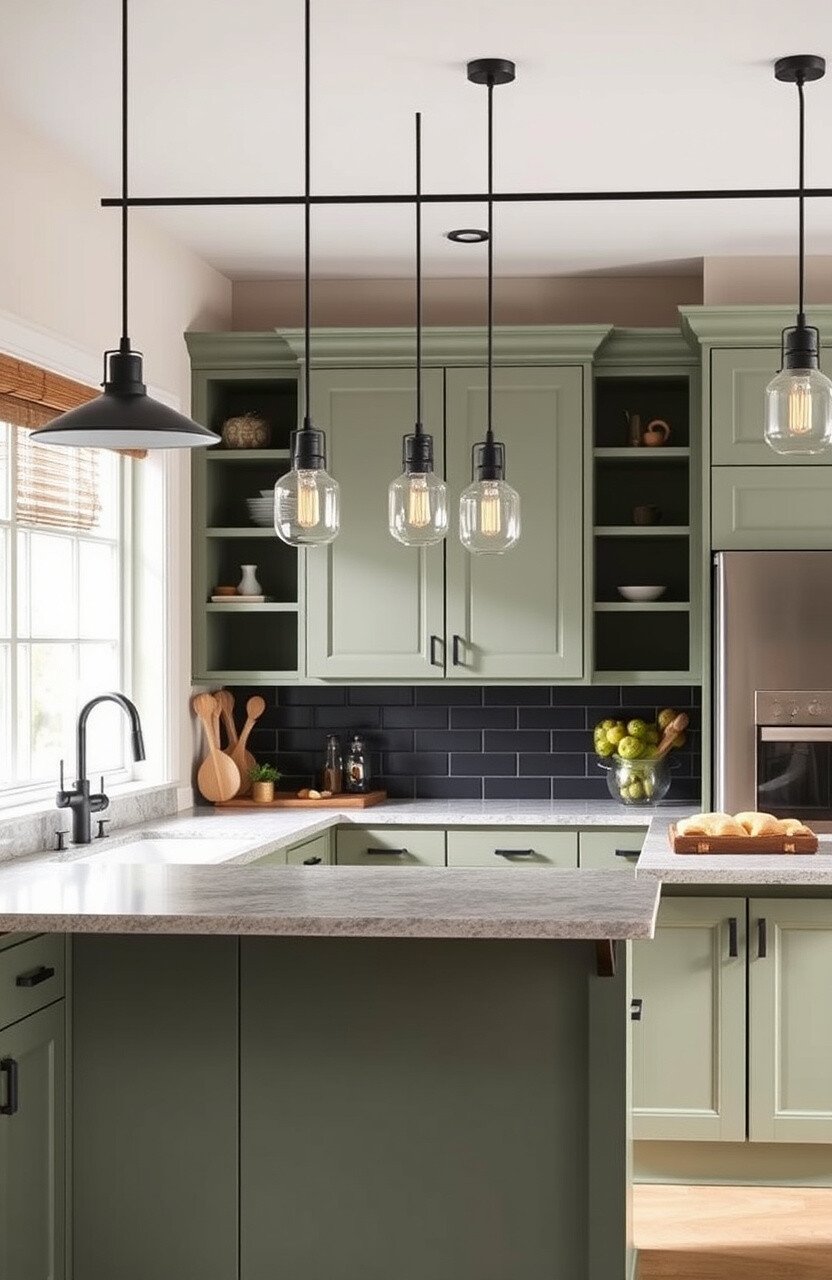 Matte sage green cabinets paired with industrial lighting fixtures can create a dramatic effect. Picture pendant lights hanging over your kitchen island.