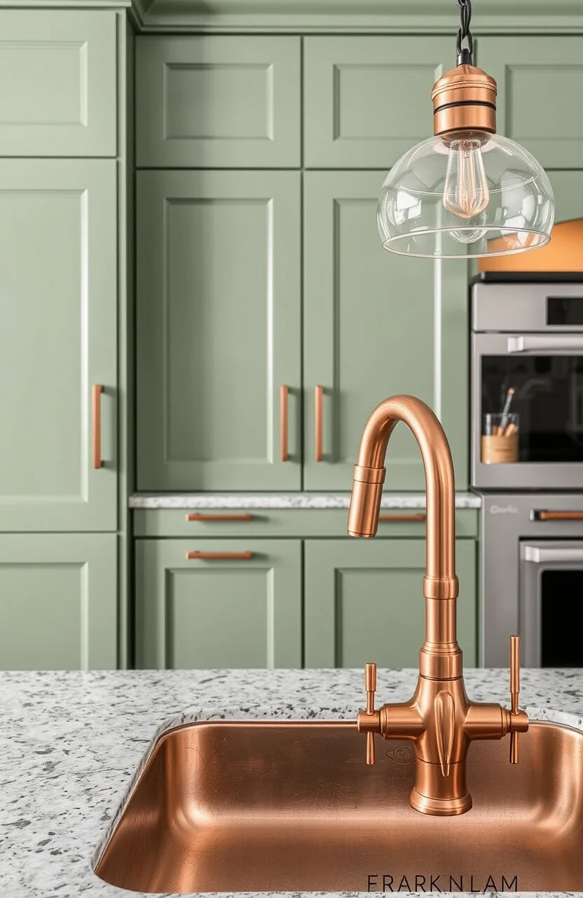 Copper accents can add warmth and richness to your sage green cabinets. Think about copper handles or a copper faucet.