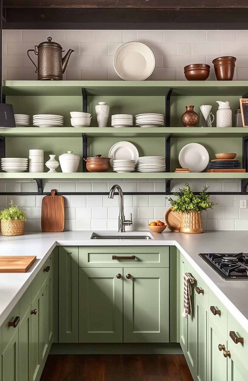 Open shelving can make your sage green cabinets feel even more spacious. It’s a great way to show off your favorite dishes or decorative pieces.
