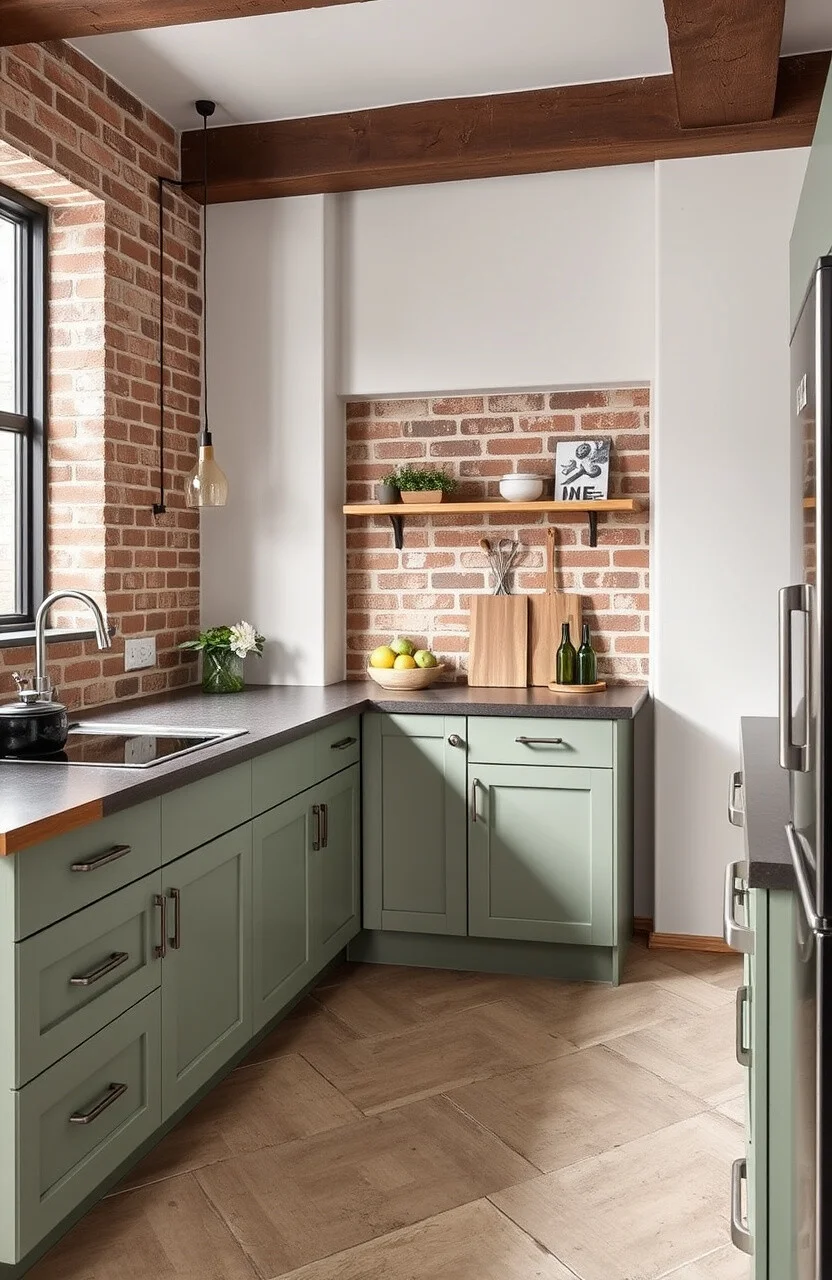 Pairing soft sage green cabinets with exposed brick walls is like a match made in heaven. The earthy tones work wonders together.