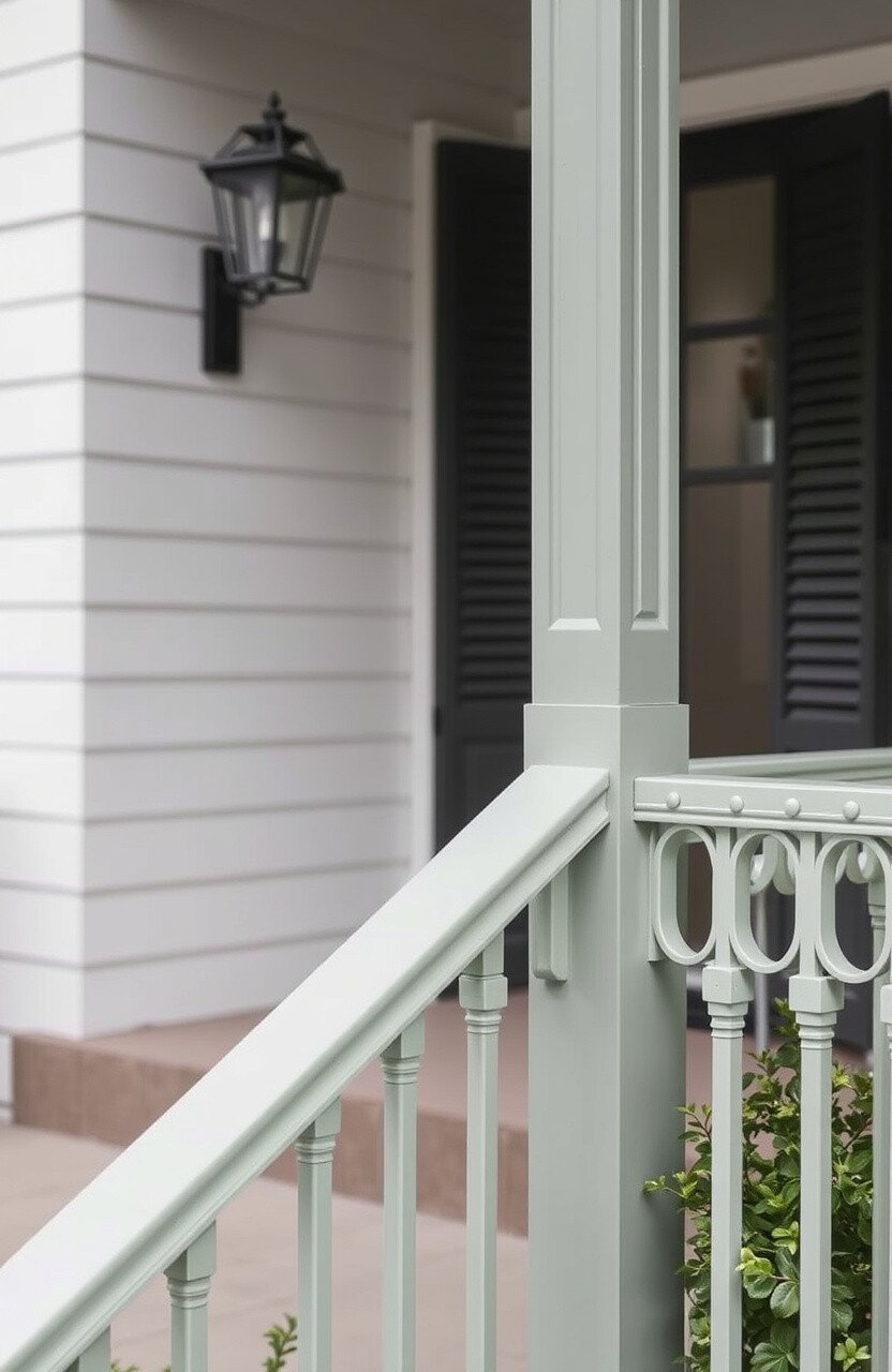 Imagine sage railings with crisp white accents. It’s as refreshing as a minty breeze! The contrast makes everything pop.