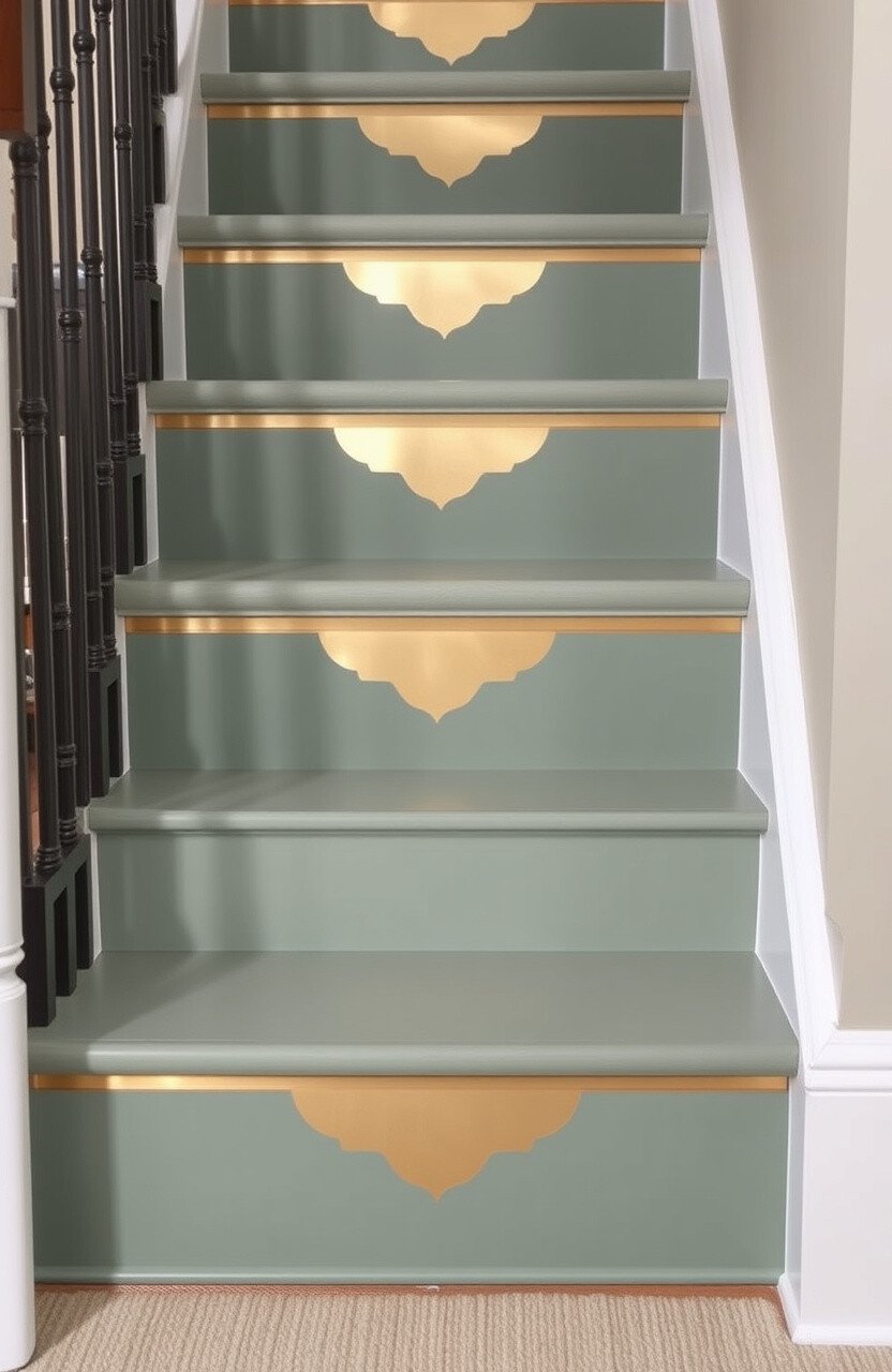 Geometric patterns in a sage tone can add a contemporary twist to your stair risers. Think triangles, squares, or even hexagons. This design is playful yet chic and can be a great conversation starter.