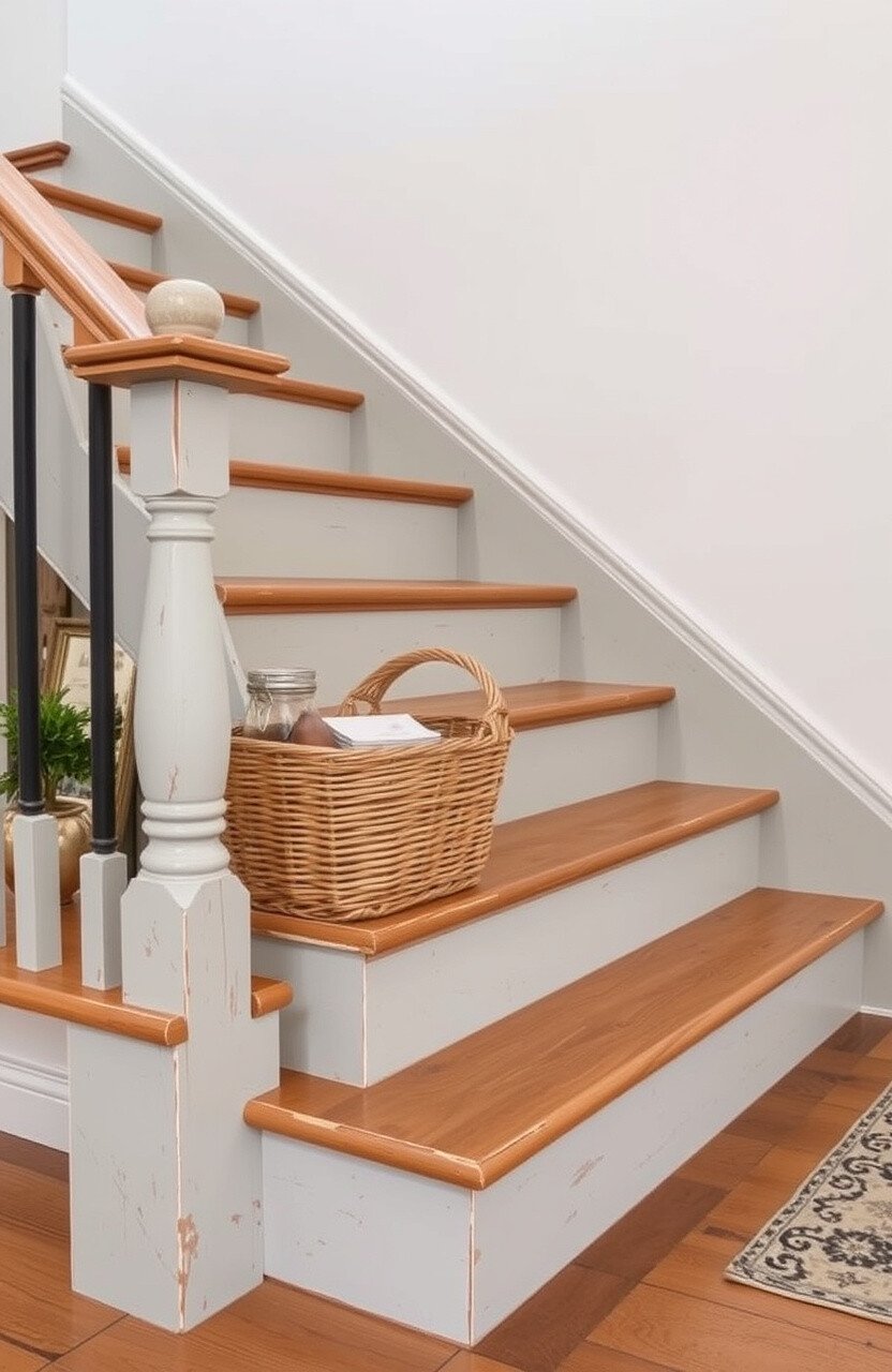 If you love the rustic style, consider a distressed sage finish on your risers. This look adds character and a vintage feel to your home. It’s like stepping into a charming countryside cottage every time you use the stairs.