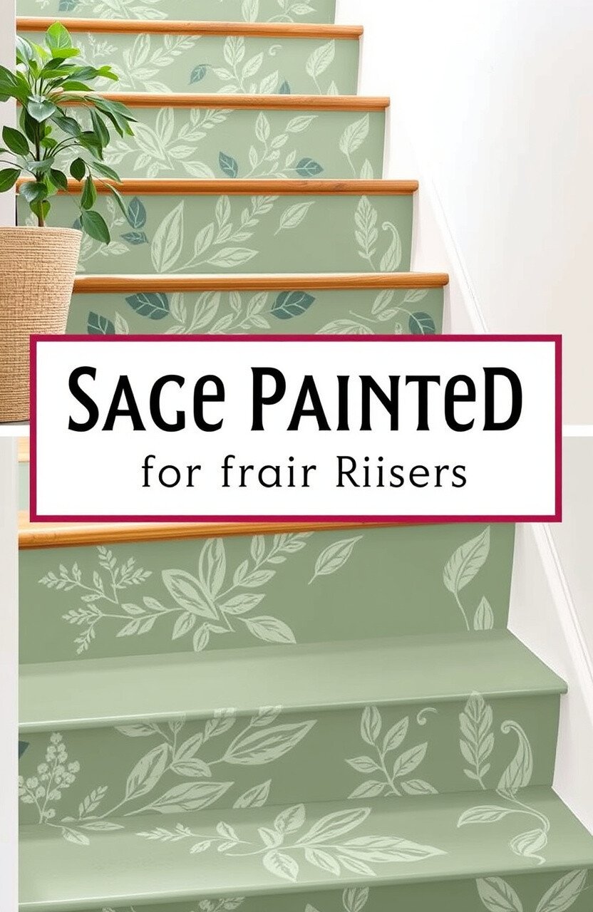Let your stairs become a canvas for art with abstract designs in sage. Use different shades to create depth and interest. This freeform style allows your creativity to shine, making each riser a masterpiece.