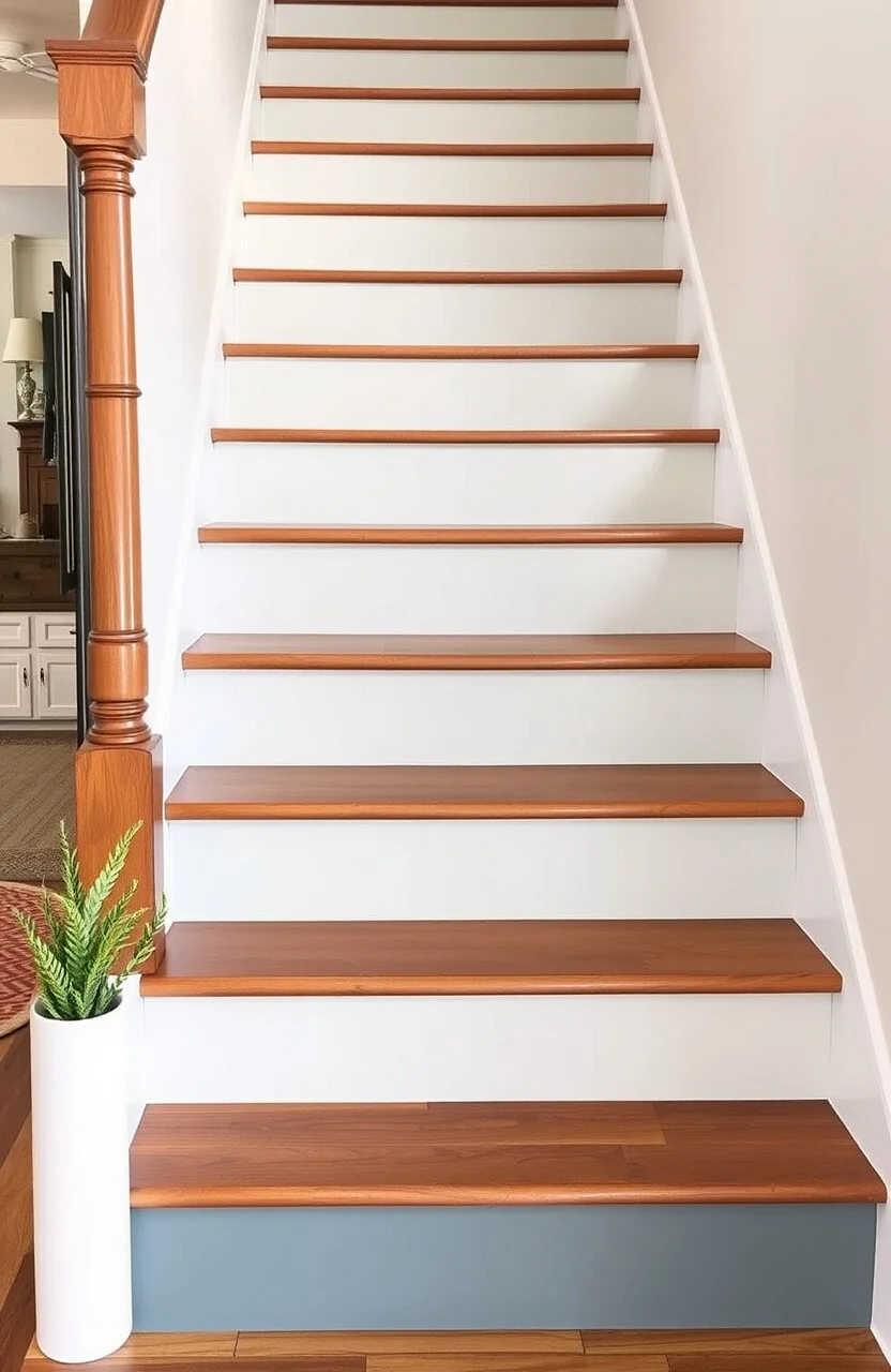 This style is unique because it plays with light, making your stairs a focal point. You can use metallic gold paint sparingly for this effect. It’s trendy and adds a touch of luxury.