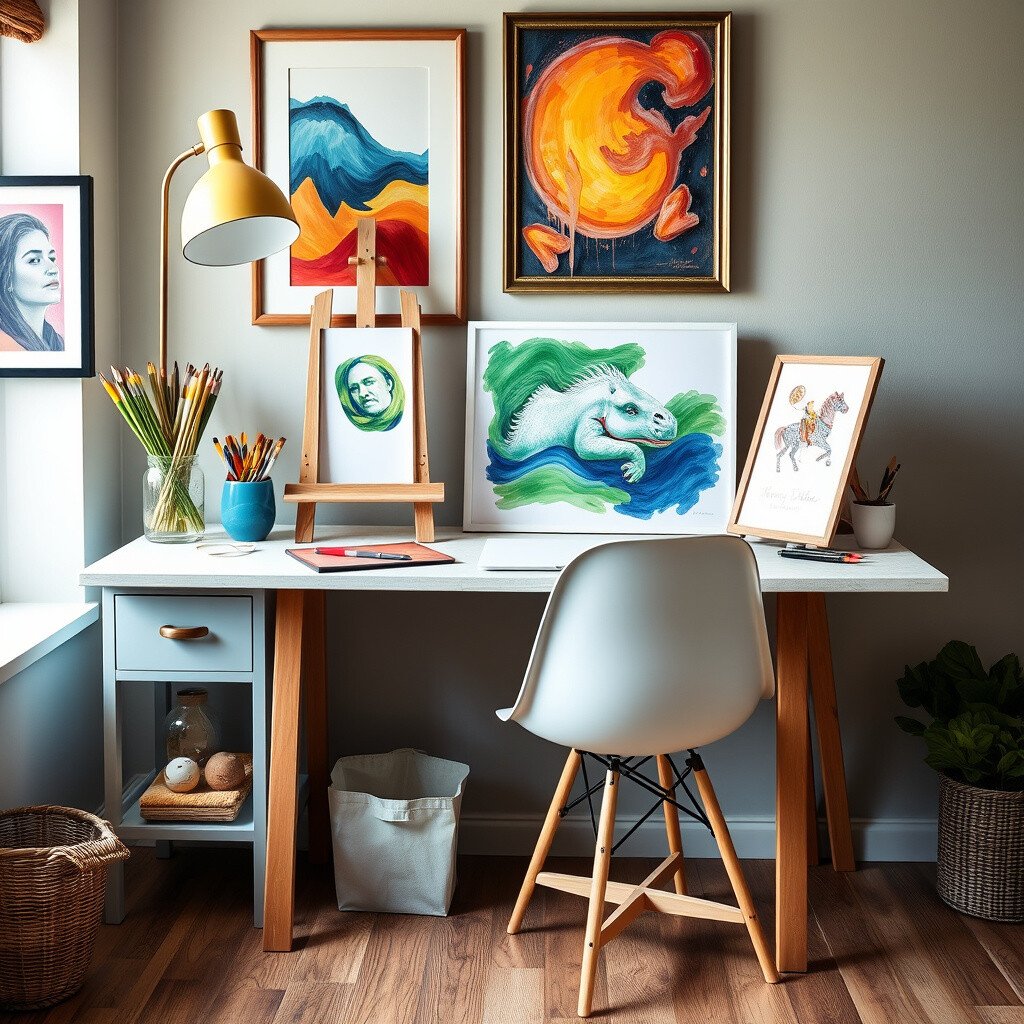 Showcase your creativity with a desk easel or a few art prints. Use colorful paintbrush holders for a fun touch.